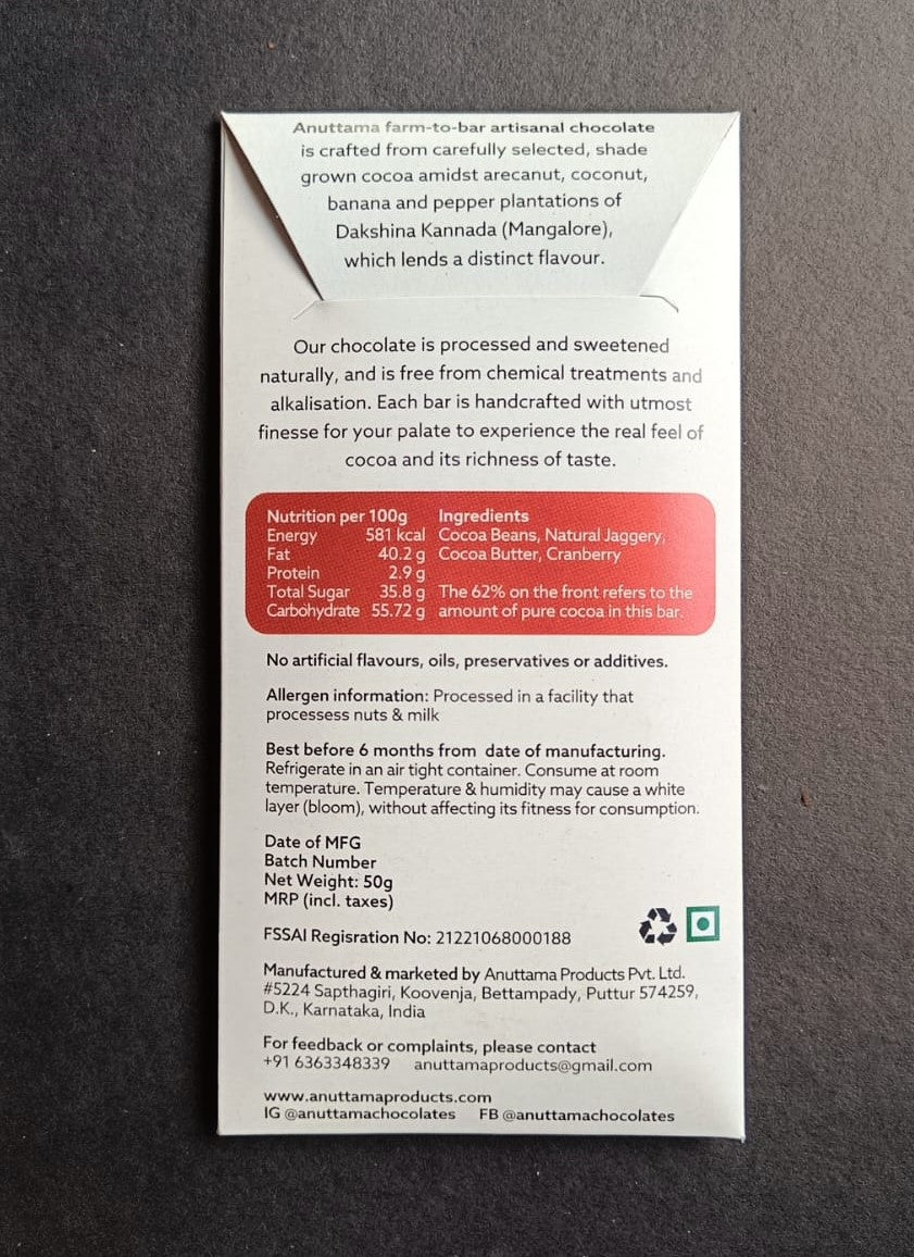 • Cranberry | 62% Cocoa | Jaggery Sweetened