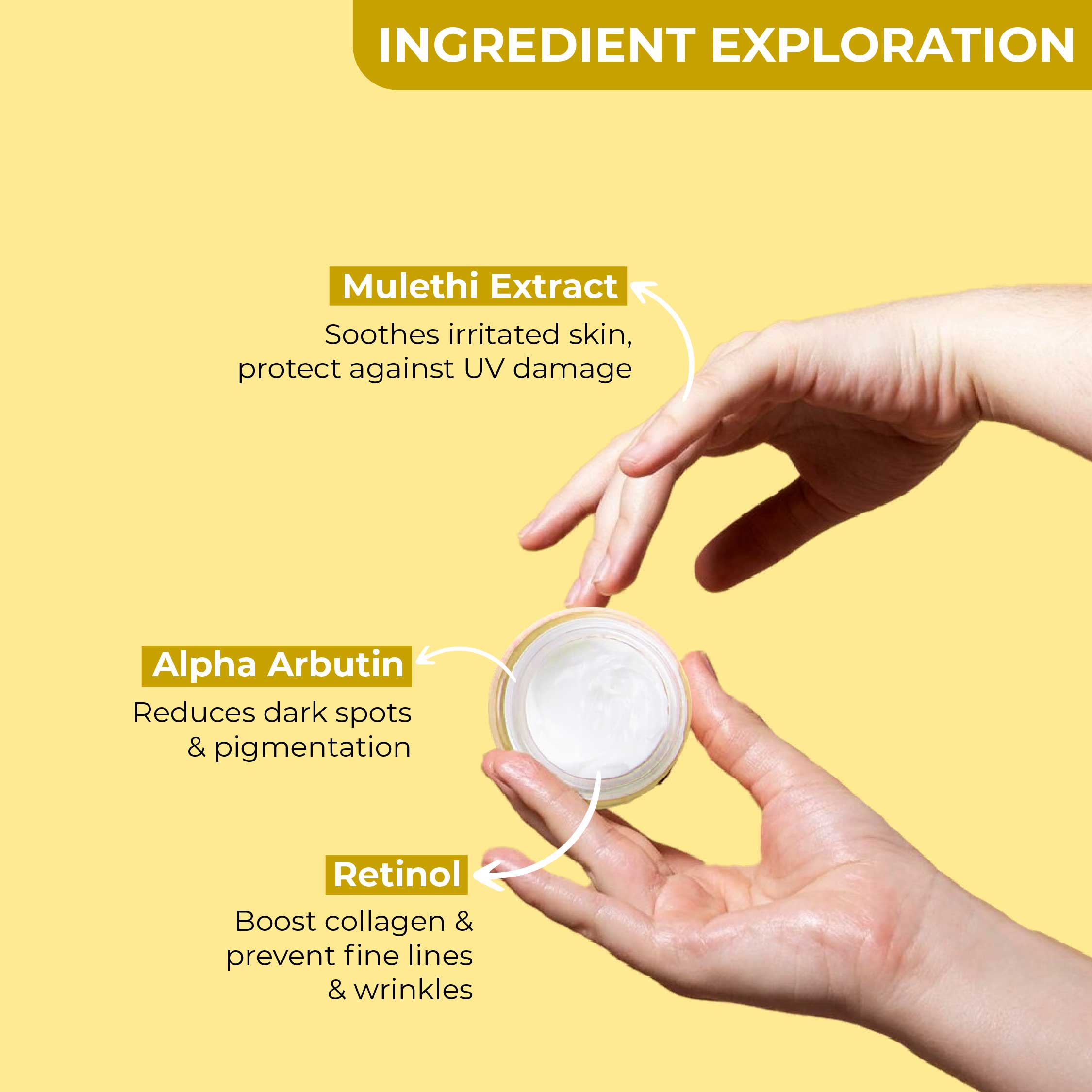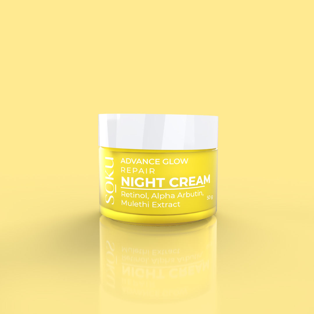 • Packed with the benefits of Retinol, Alpha Arbutin and Mulethi Extract, SOKU Glow Repair Night Cream, brightens and uplifts skin overnight for a lively and well-rested appearance in the morning
