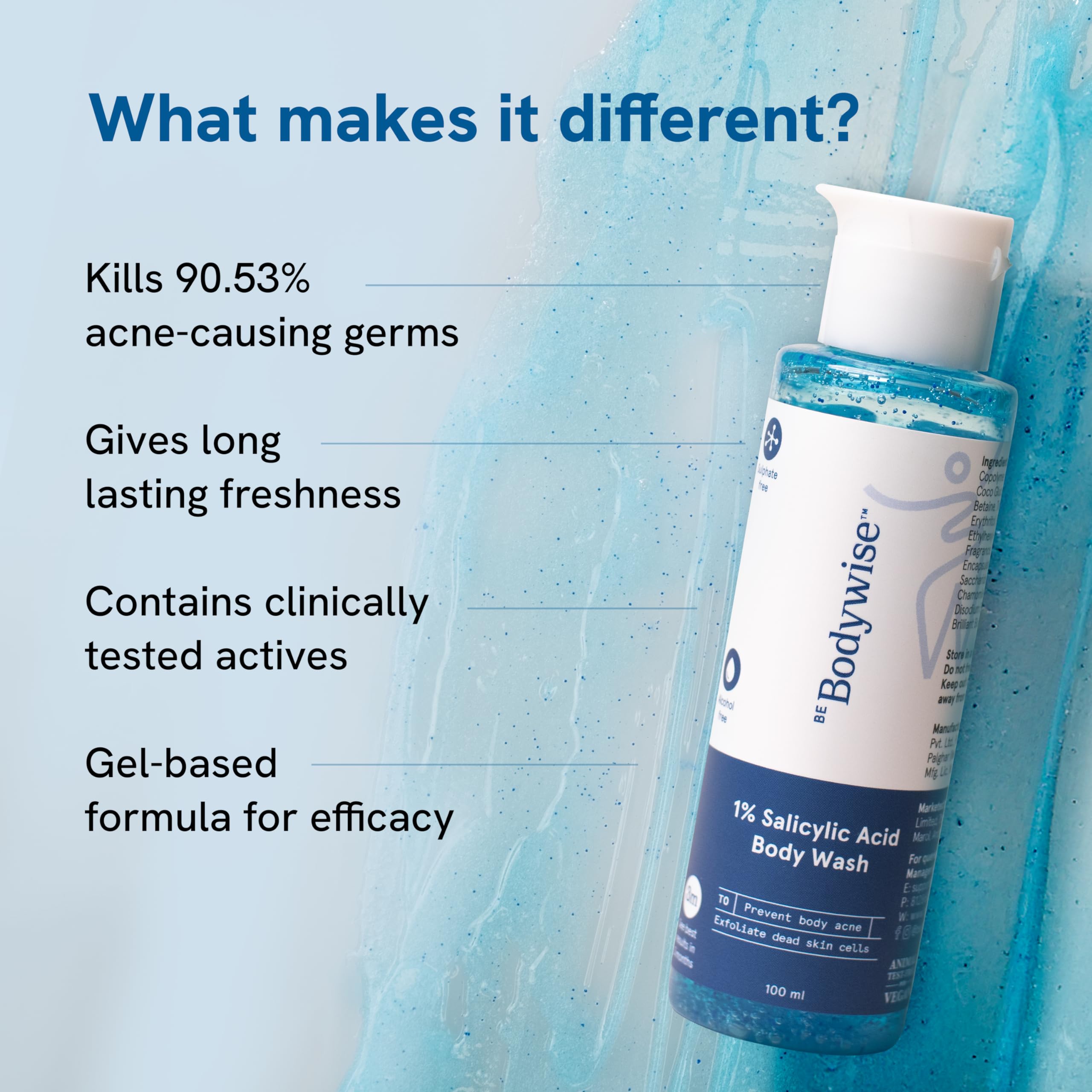 • Body wise 1% Salicylic acid body wash acts as an antibacterial agent that helps in reduce body acne and soothes your skin, leaving no rash or irritation on your body when used regularly for upto 3 months