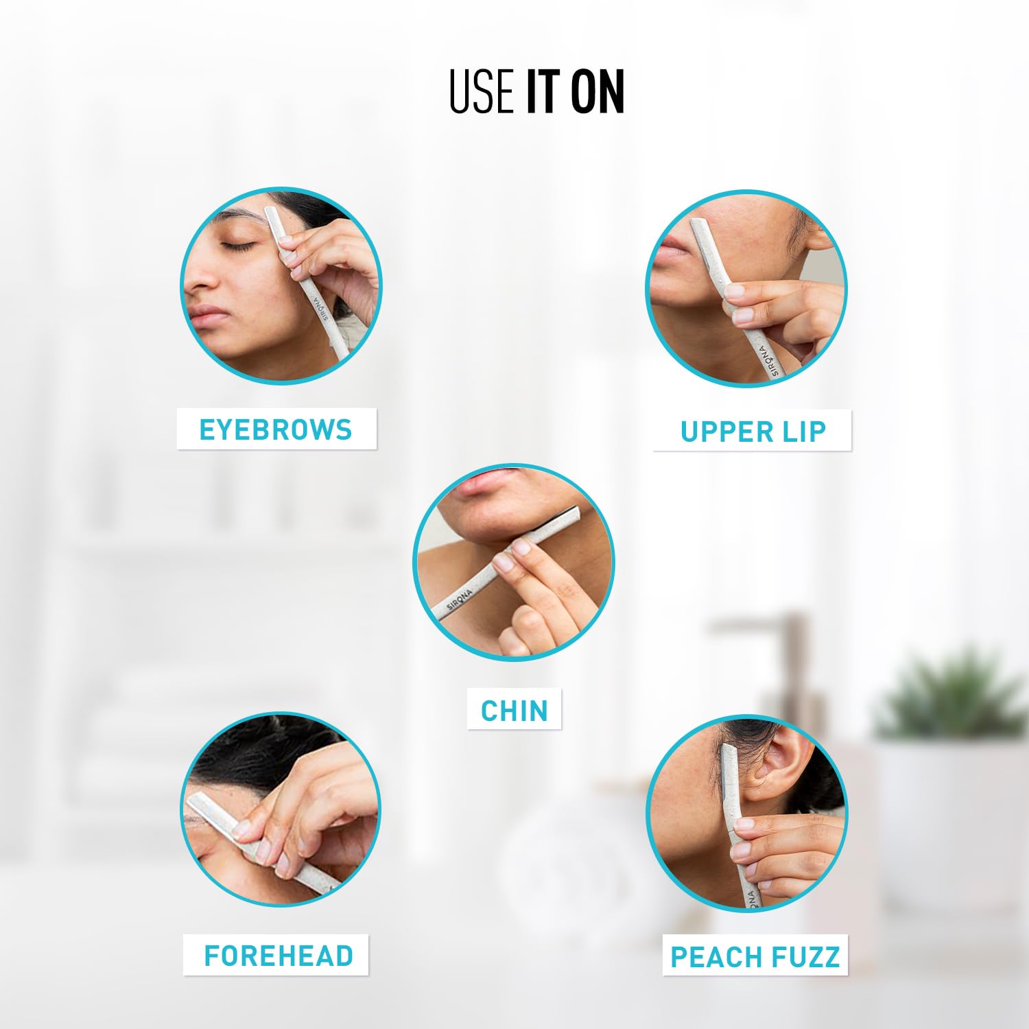 1. Cleanse and moisturise face. 2. Pull tight skin and gently glide blade against the direction of hair growth in small strokes. 3. Wash the blade. Let it dry and put on the cap. 4. Massage the shaved area with a soothing moisturiser.