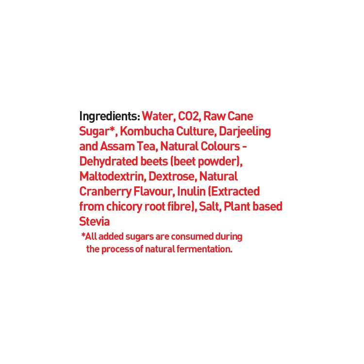 Water, Co2, Raw cane Sugar, Live Probiotic Kombucha Culture, Darjeeling Black Tea, Natural colour- Dextrose, Natural Cranberry Flavour, Inulin [ Extracted from chicory root fiber], salt, Plant based stevia.