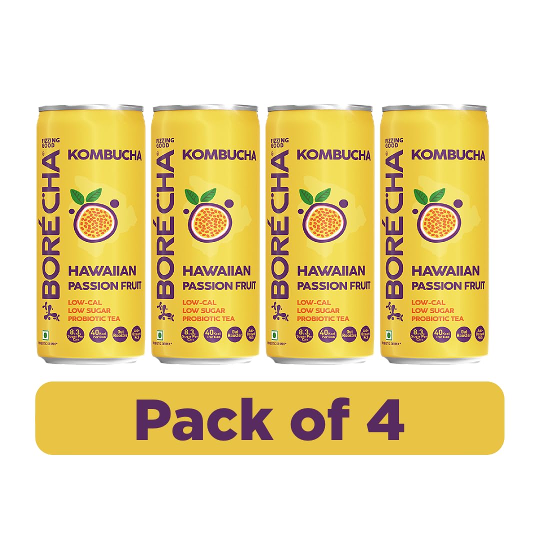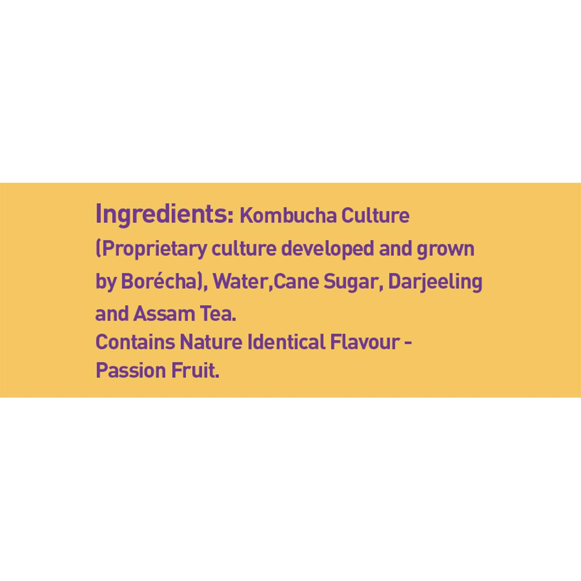 Kombucha (Water, Live Probiotic Kombucha Culture (Komagataeibacter sp., A. musti, A. tropicalis), Cane Sugar, Assam Black Tea, Darjeeling Black Tea), Nature Identical Flavouring Substances (Passion Fruit), Indian Gooseberry, Bibhitak, Haritaki, Licorice Root, Carbon Dioxide (INS 290)