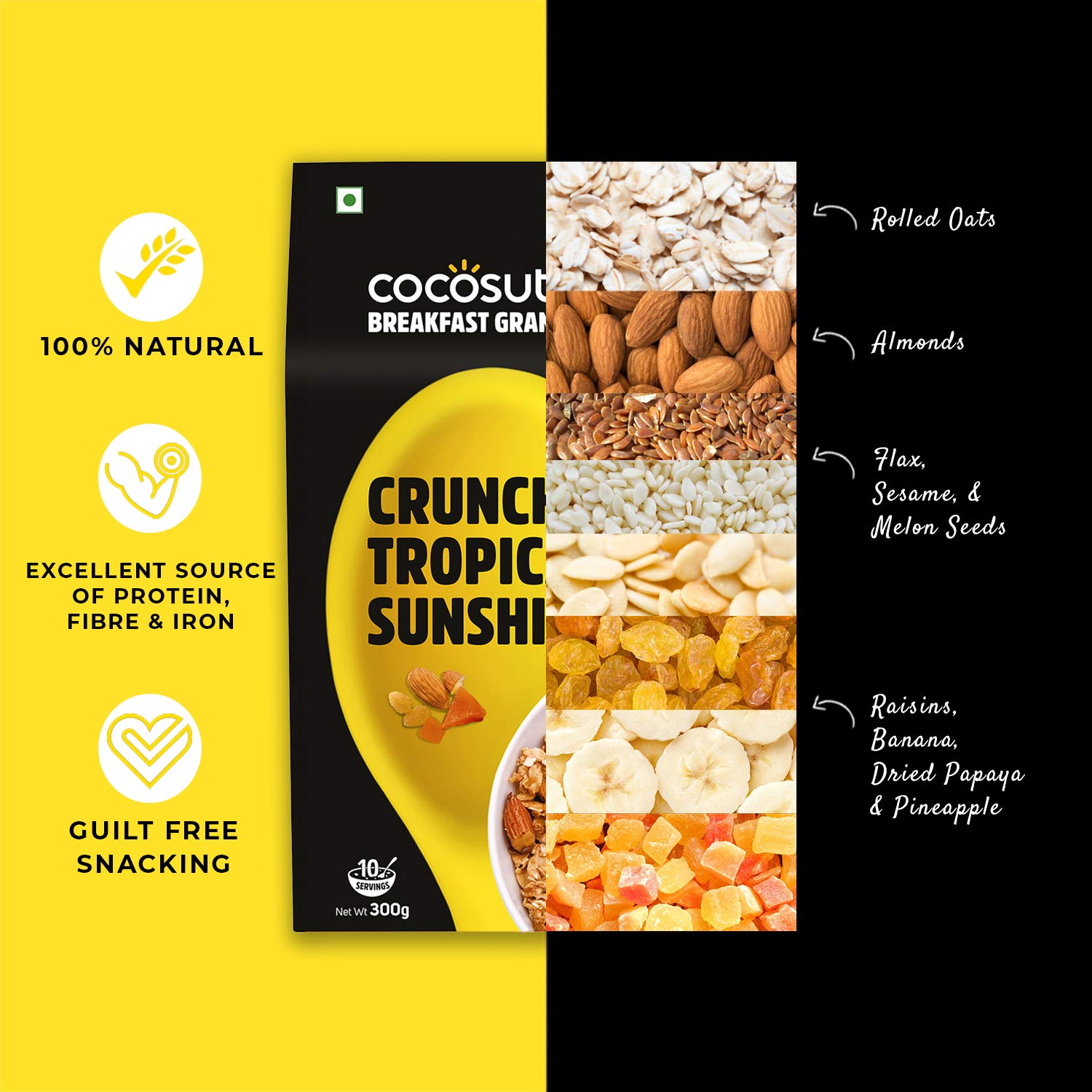 Tropical Delight: Crunchy granola with rolled oats, nuts, seeds, fruit puree, and tropical flavors.