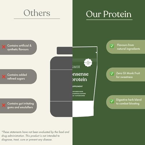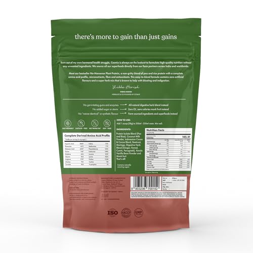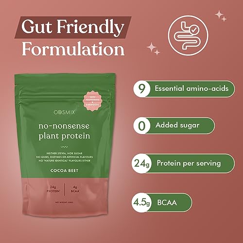 • No-nonsense plant protein by Cosmix has a proprietary blend of gut-loving mixes that includes ginger, fennel, cumin, and fenugreek. This gut-friendly blend helps improve digestion and absorption of the protein.