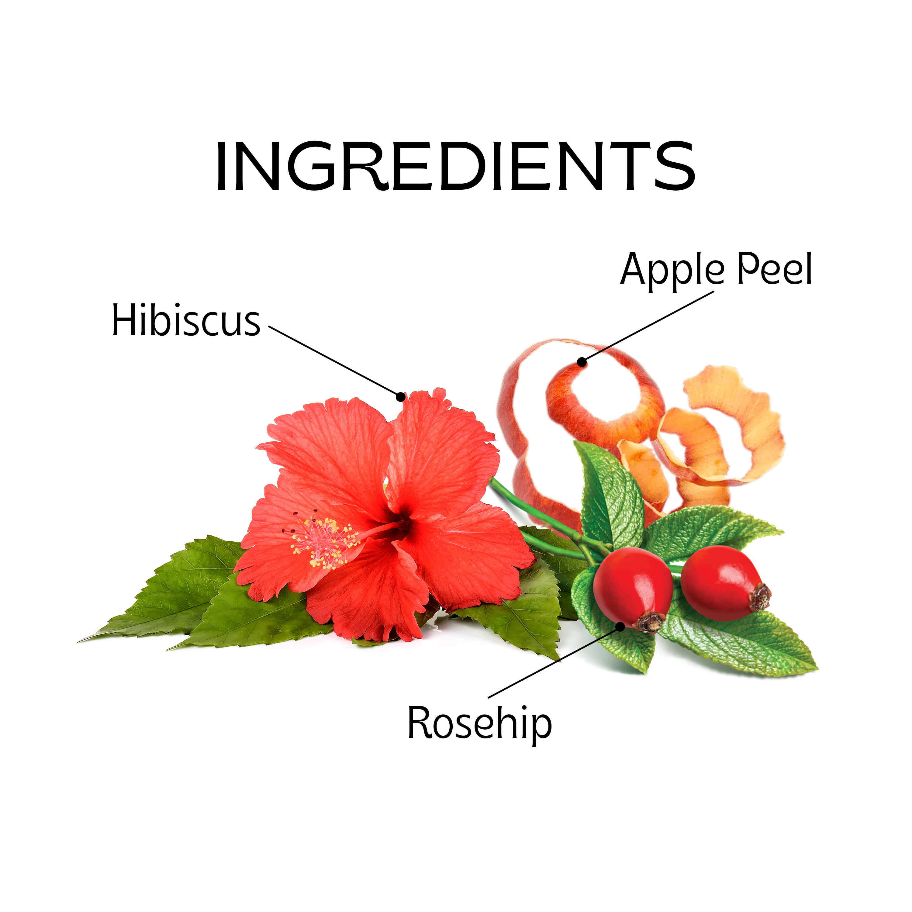Hibiscus(43%), Rosehip(36%), Apple Peel(16%), Natural Apple Flavour (2.5%), Natural Cranberry Flavour(2.5%)