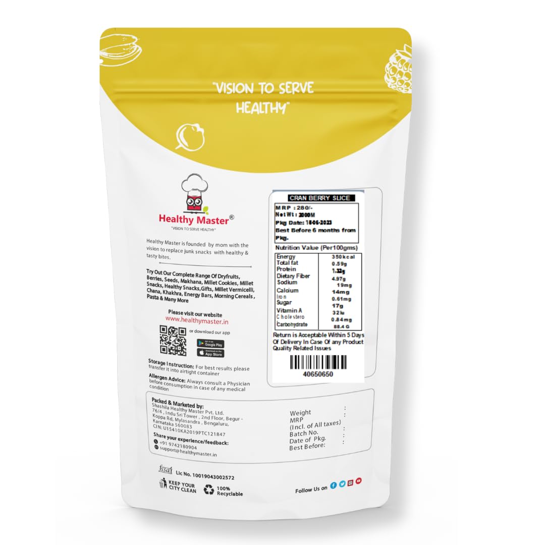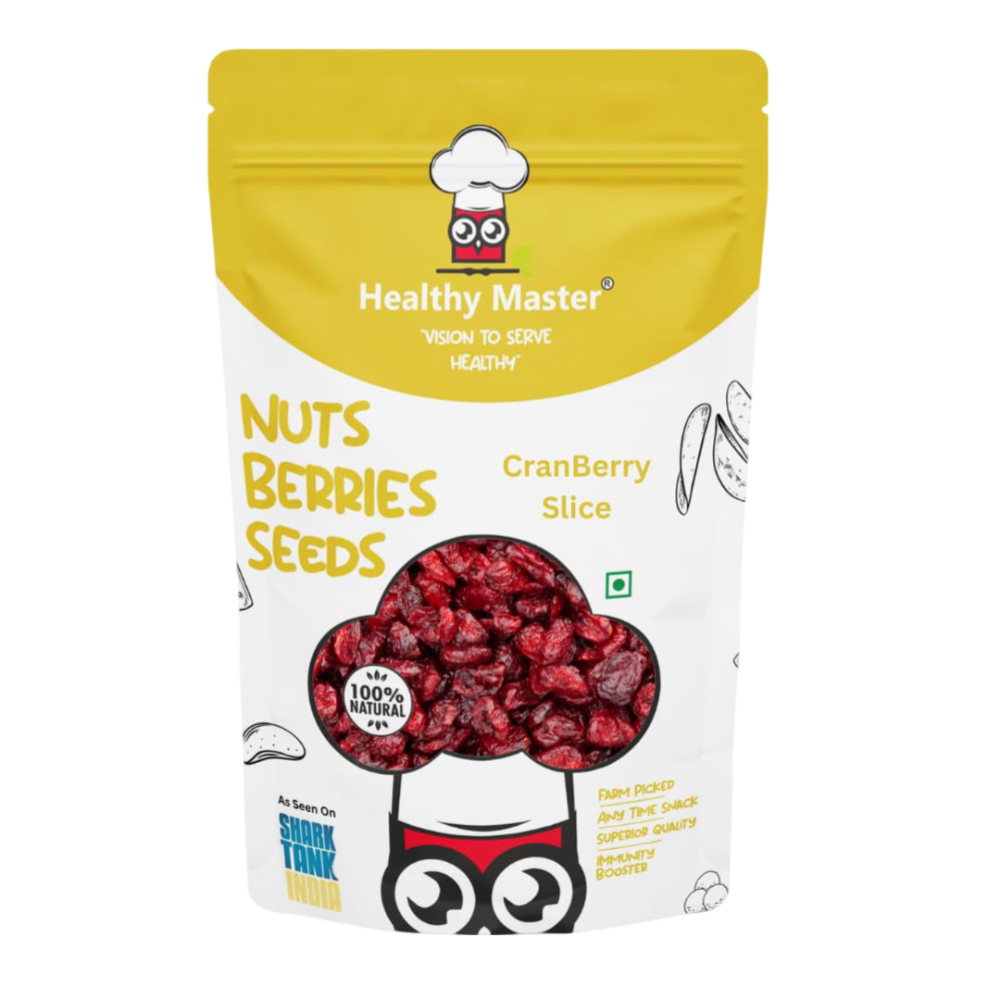 All Natural, Premium Quality and Delicious Dried Sliced Cranberries. High in various micronutrients & fibre, these berries are excellent addition to your cereal, granola bars and other baked goods. Cranberries are good source of dietary fibre and regularly consuming of it dietary fibre helps to reduce cardiovascular disease.