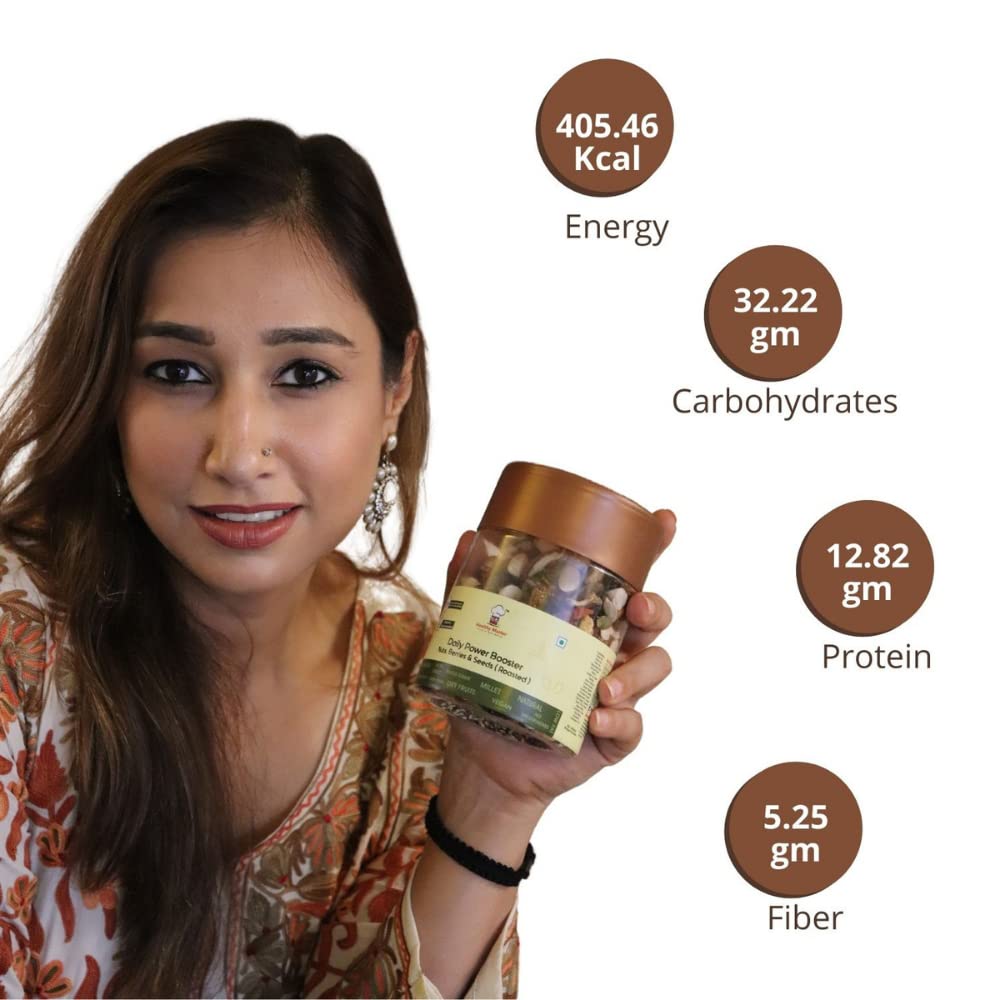 Why Healthy Master Power Booster? This 23+ ingredient mix constitutes world-class internationally sourced Naturally Sun Dried nuts, seeds, berries and fruits. These Energy Power Booster mix of nuts, seeds, and berries will help you conquer your energy slump all day and do amazing things.