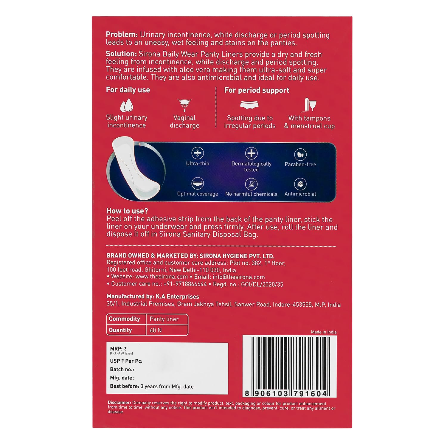 • Each package contains 60 Sirona dry comfort panty liners
