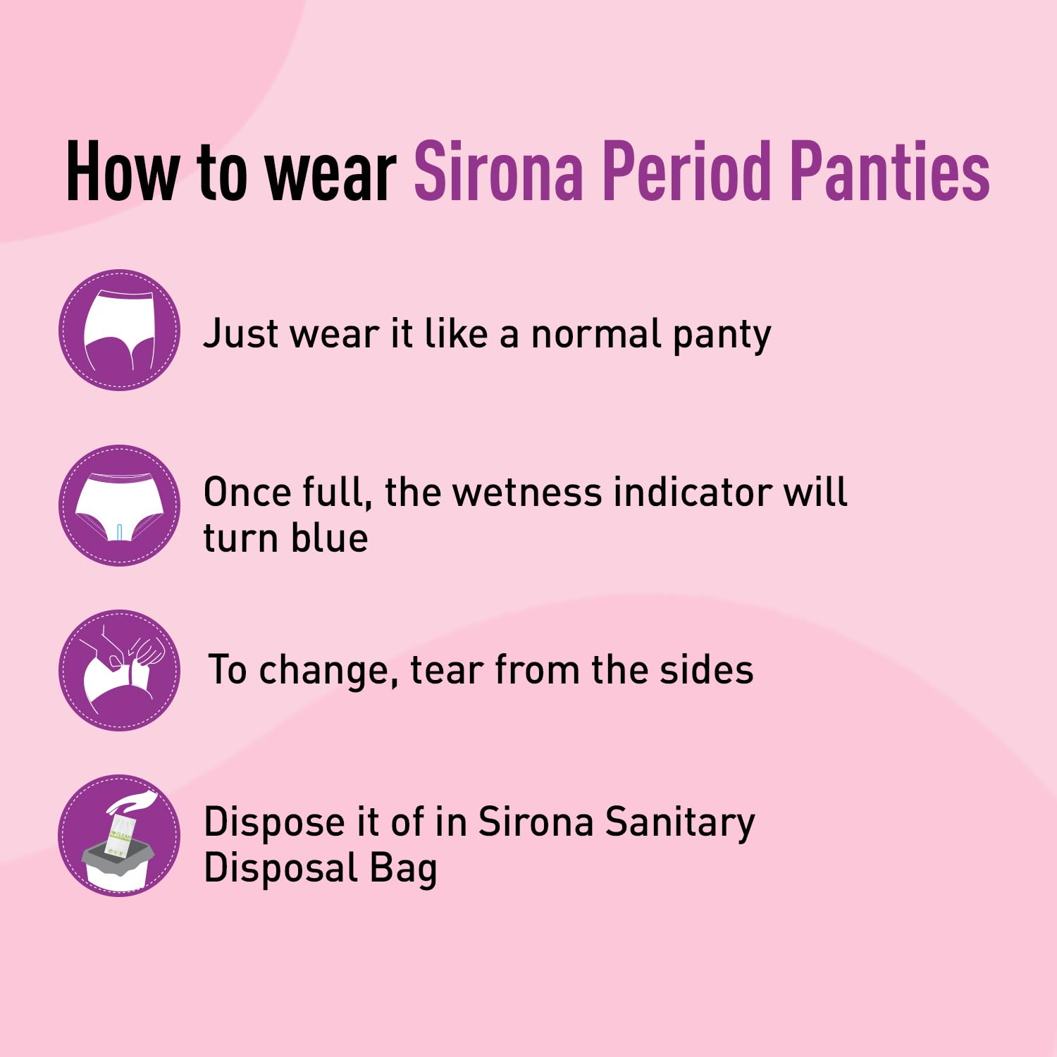 Position the coloured waistband on the front and wear it in the same way as normal panties. Dispose of it responsibly: 1. To remove, tear it from the sides. 2. Use a Sirona Disposal Bag to dispose of the panty responsibly in the bin.