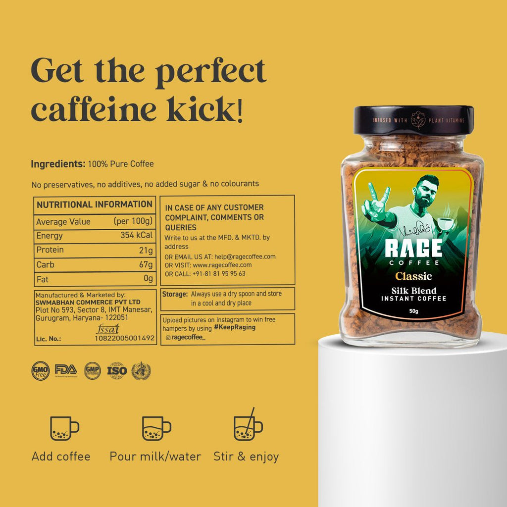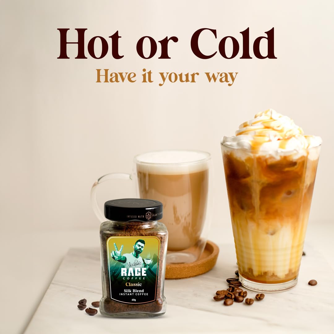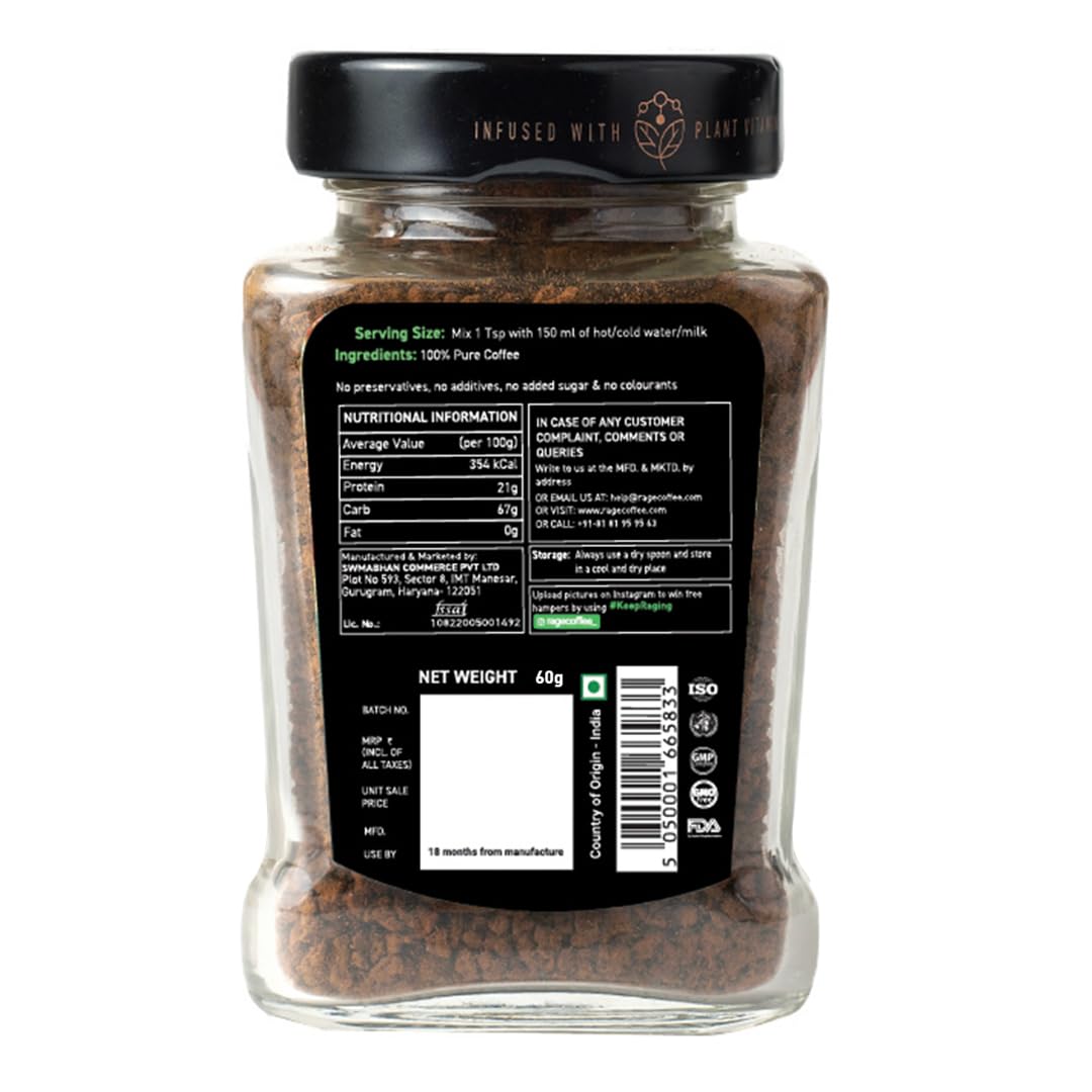 Experience the exquisite flavor of gourmet instant coffee crafted with premium Arabica beans. Rage instant coffee delivers strong, silky notes for an extraordinary taste. Enjoy its intense freshness and aroma in every cup, whether hot or cold, with water or milk. Bold, smooth, and full-bodied, it offers a rich coffee experience. Keep it stored in a cool, dry place to preserve its quality. Size: 60g.