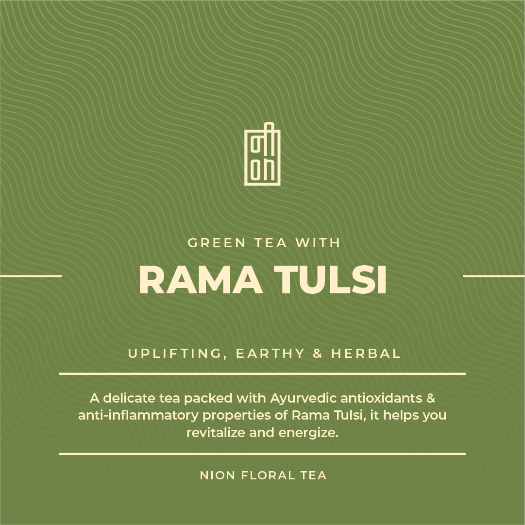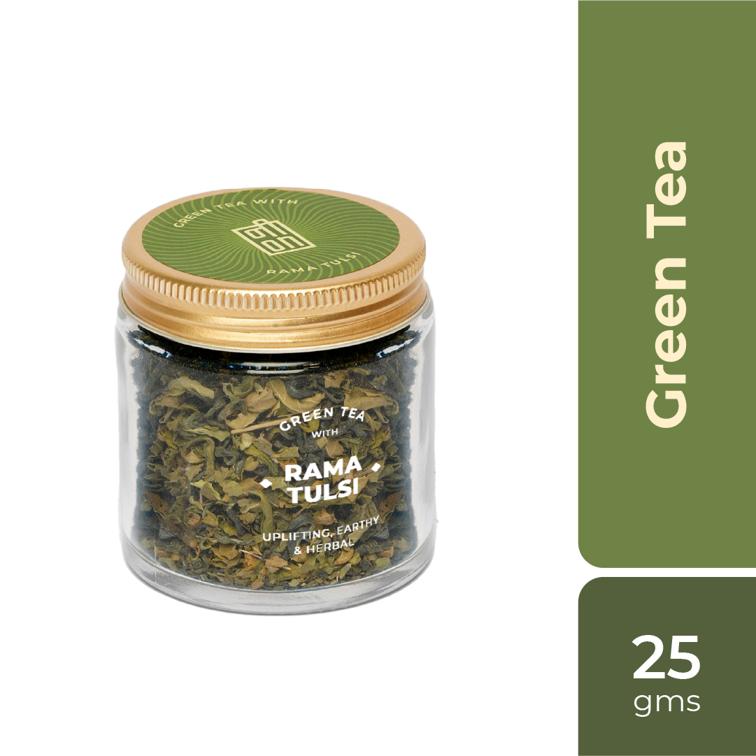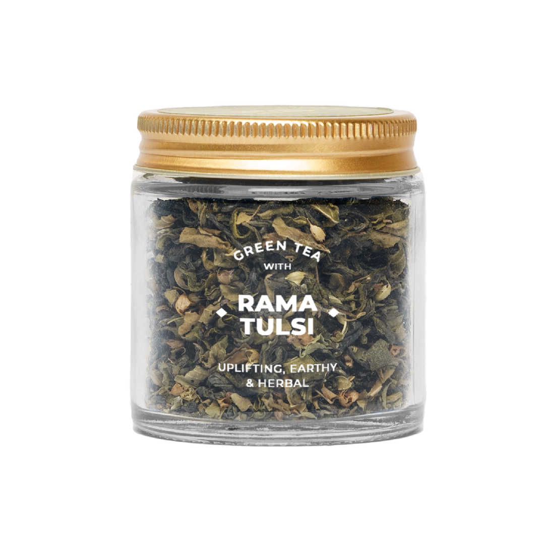 Green Tea with Rama Tulsi: A rejuvenating blend of ancient Ayurvedic herbs that promotes wellness, reduces stress, and enhances skin and hair health. Bursting with natural antioxidants and anti-inflammatory properties, this tea is perfect for a revitalizing morning or afternoon pick-me-up.