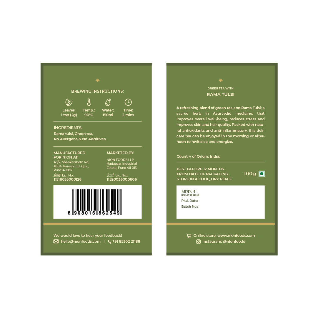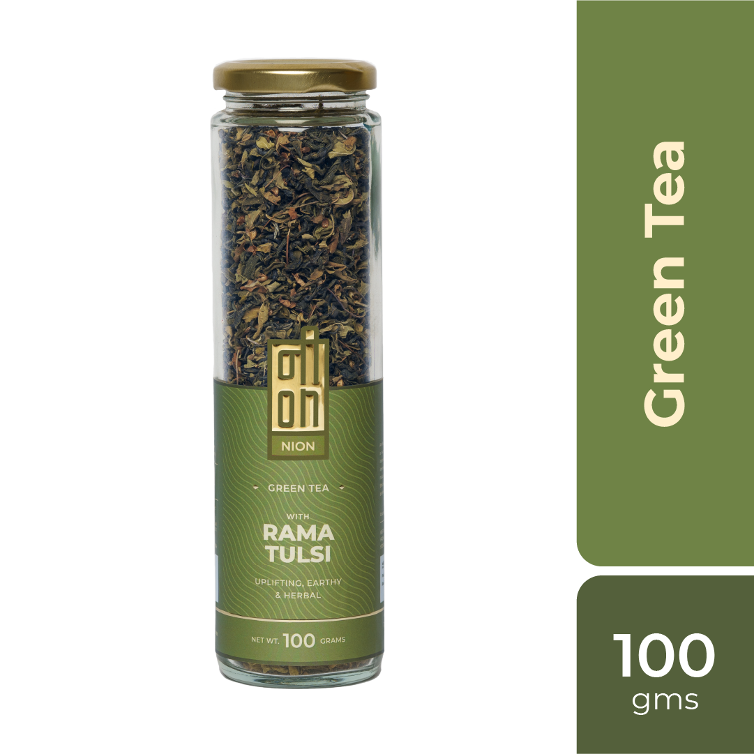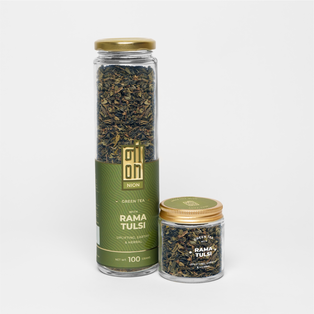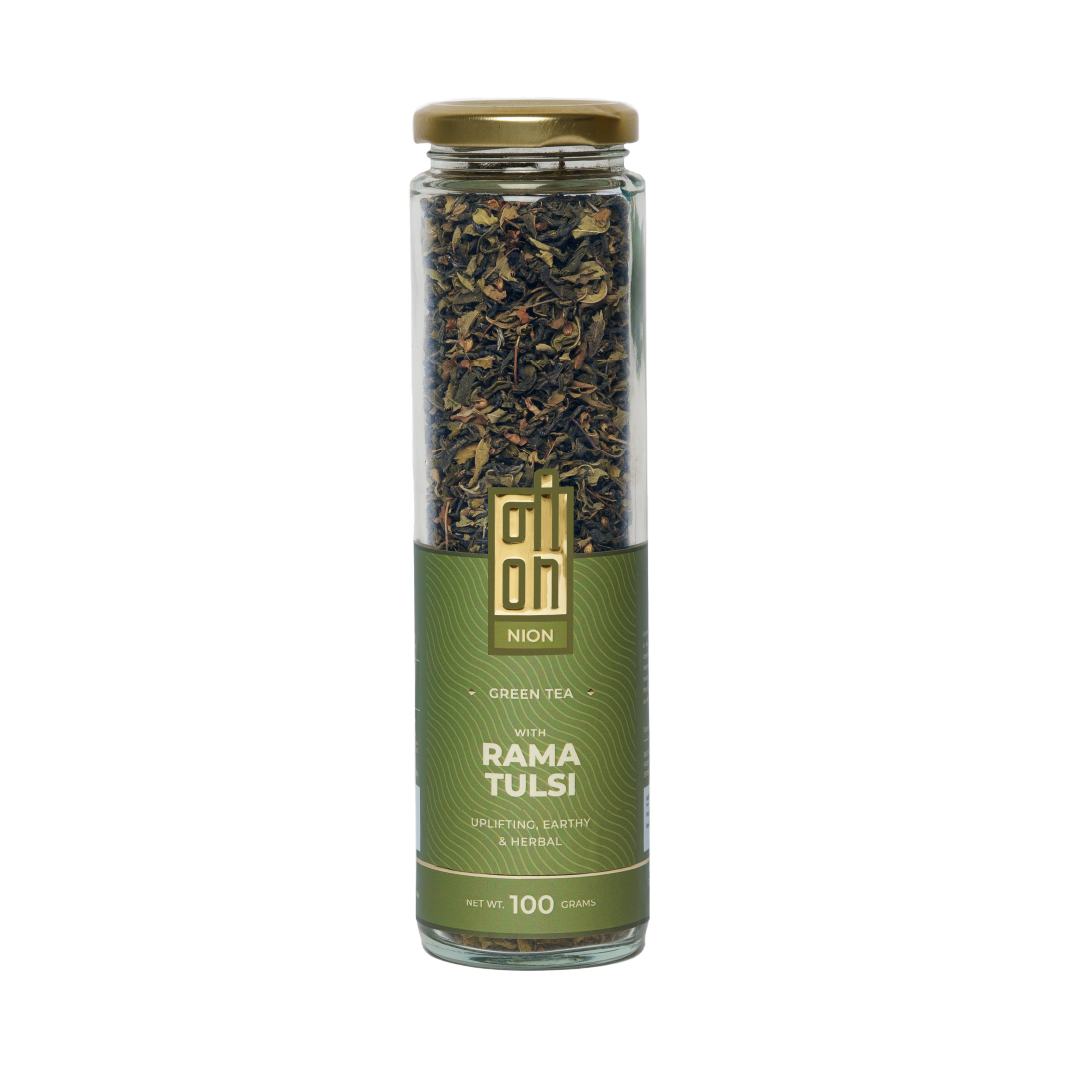 Green Tea with Rama Tulsi: A rejuvenating blend of ancient Ayurvedic herbs that promotes wellness, reduces stress, and enhances skin and hair health. Bursting with natural antioxidants and anti-inflammatory properties, this tea is perfect for a revitalizing morning or afternoon pick-me-up.