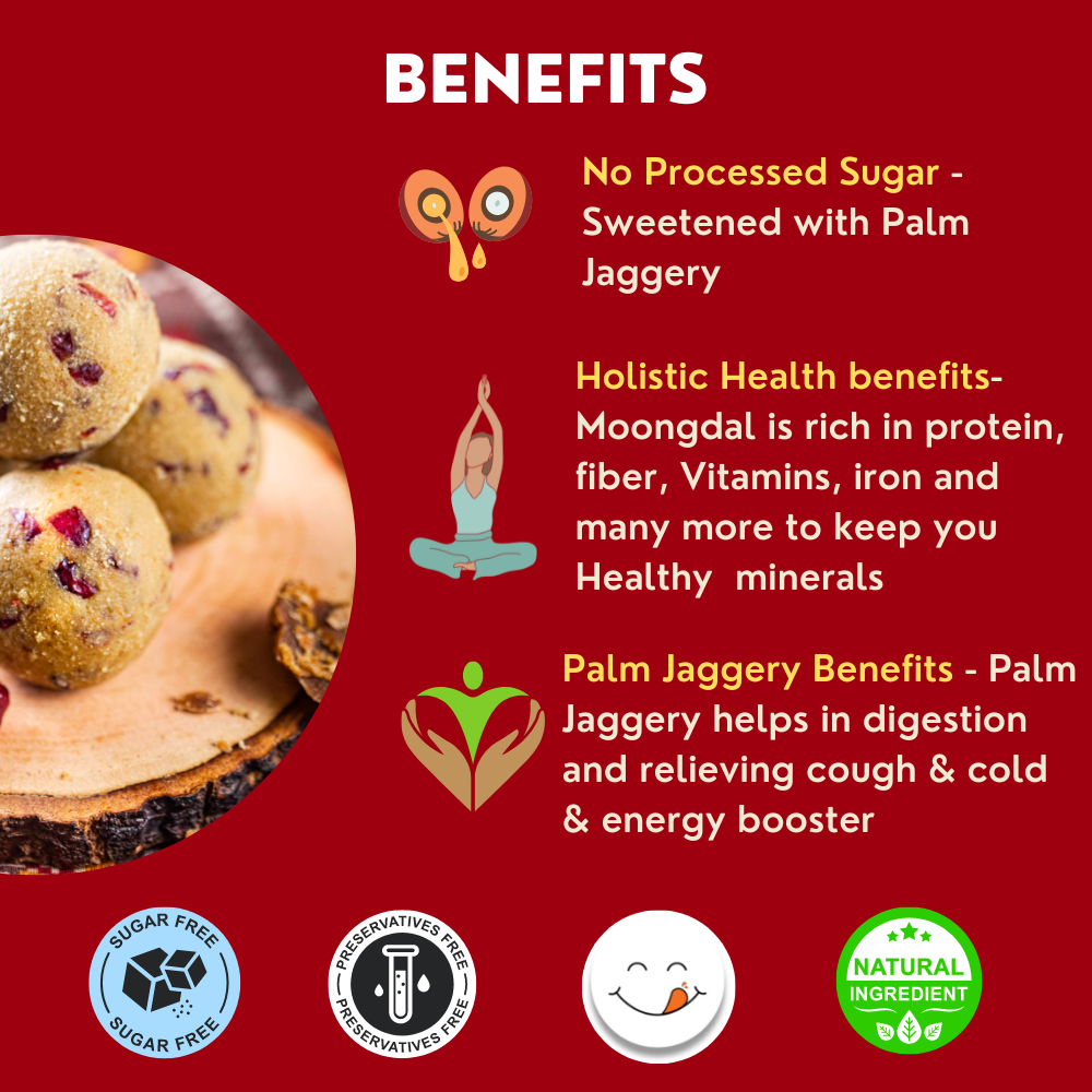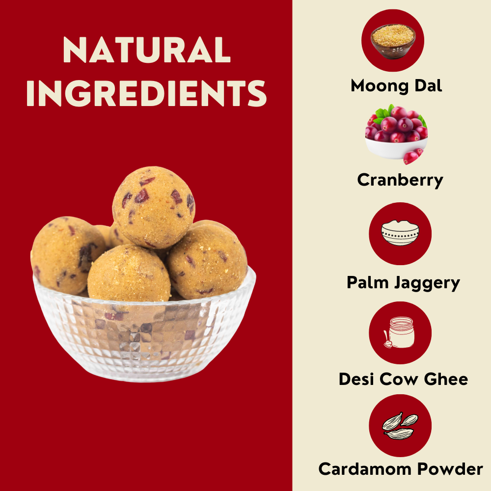 Introducing our delightful Moongdal Cranberry Laddoo, crafted without processed sugar, artificial sweeteners, or preservatives. Handcrafted with care, these laddoos blend premium moong dal, natural sweetener palm jaggery, tangy sun-dried cranberries, and desi cow ghee. Perfect for any occasion or as a guilt-free snack, they offer a burst of flavor and natural sweetness. Enjoy this healthy treat that combines tradition with innovation in every bite!