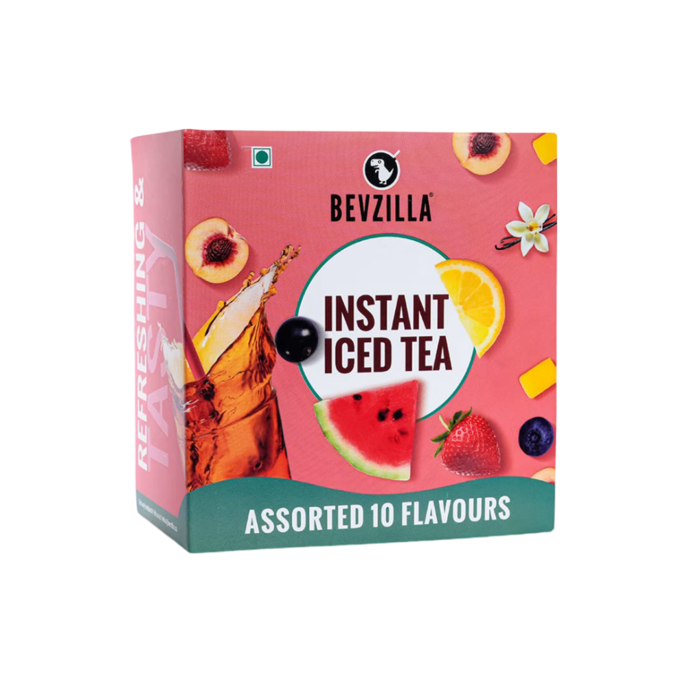 Bevzilla's Flavoured Iced Tea Mix: 15 flavors in assorted, 250gms & 500gms packs. Delicious, hydrating, and cooling for summer. Instantly soluble, full of Vitamin C. No brewing needed - strong, flavorful cold brew. Convenient sachets for quick, easy enjoyment!