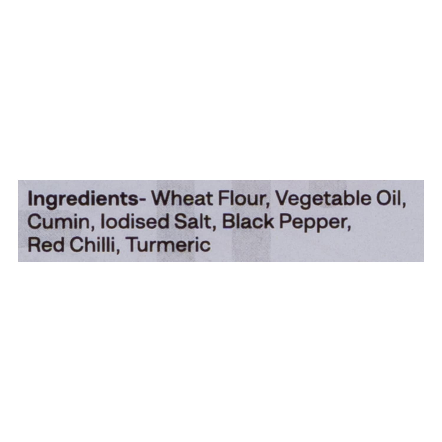 Wheat Flour, Vegetable oil, Cumin, Lodised Salt, Black Pepper, Red Chilli, Turmeric