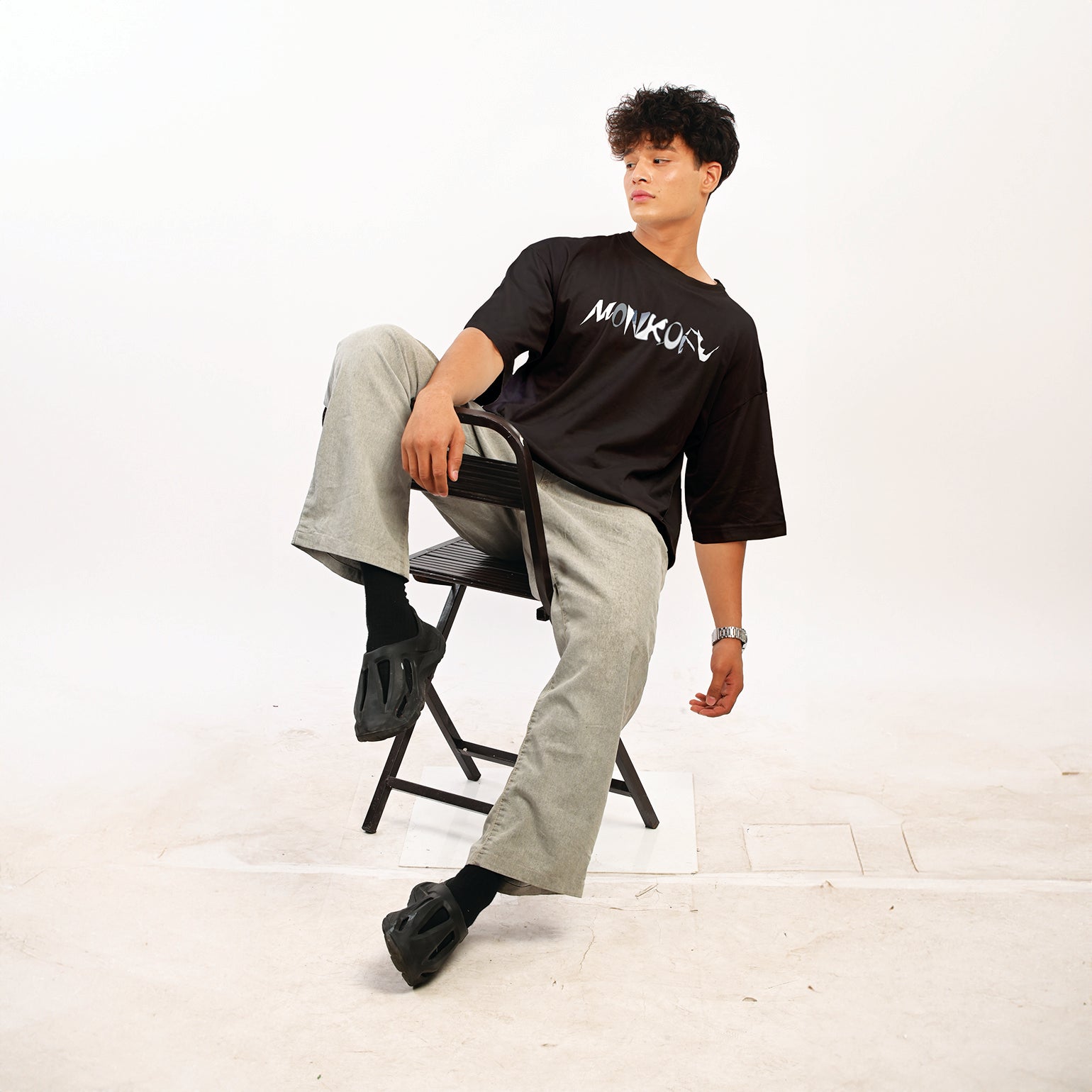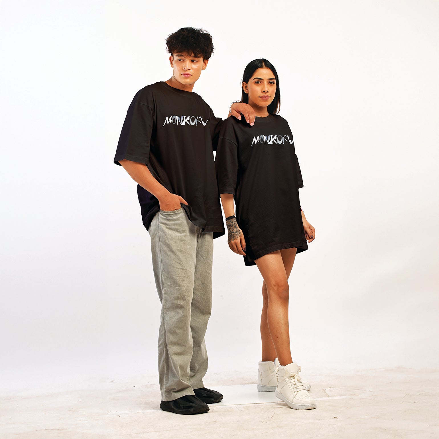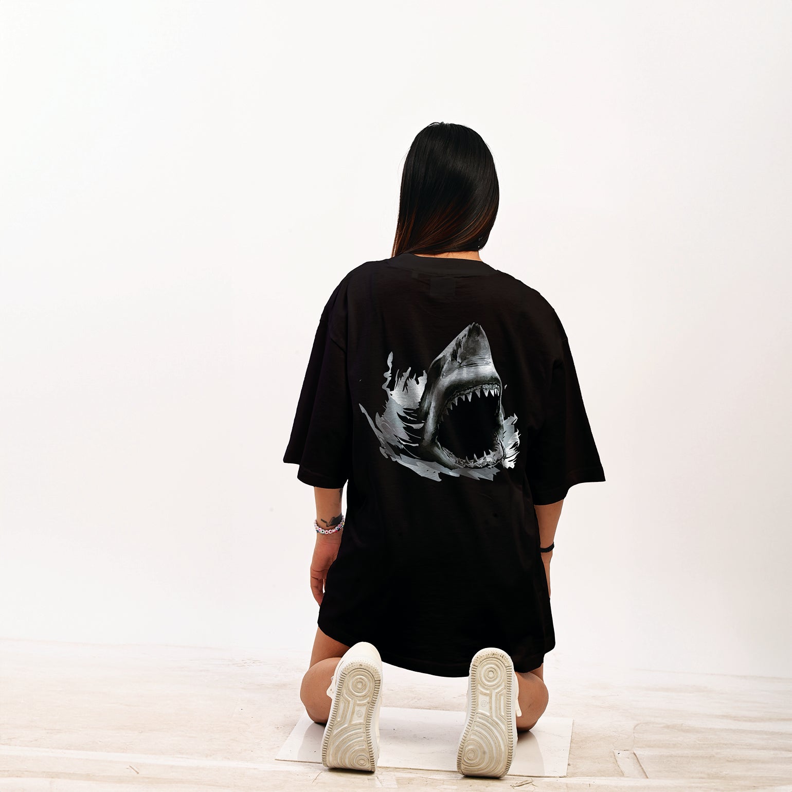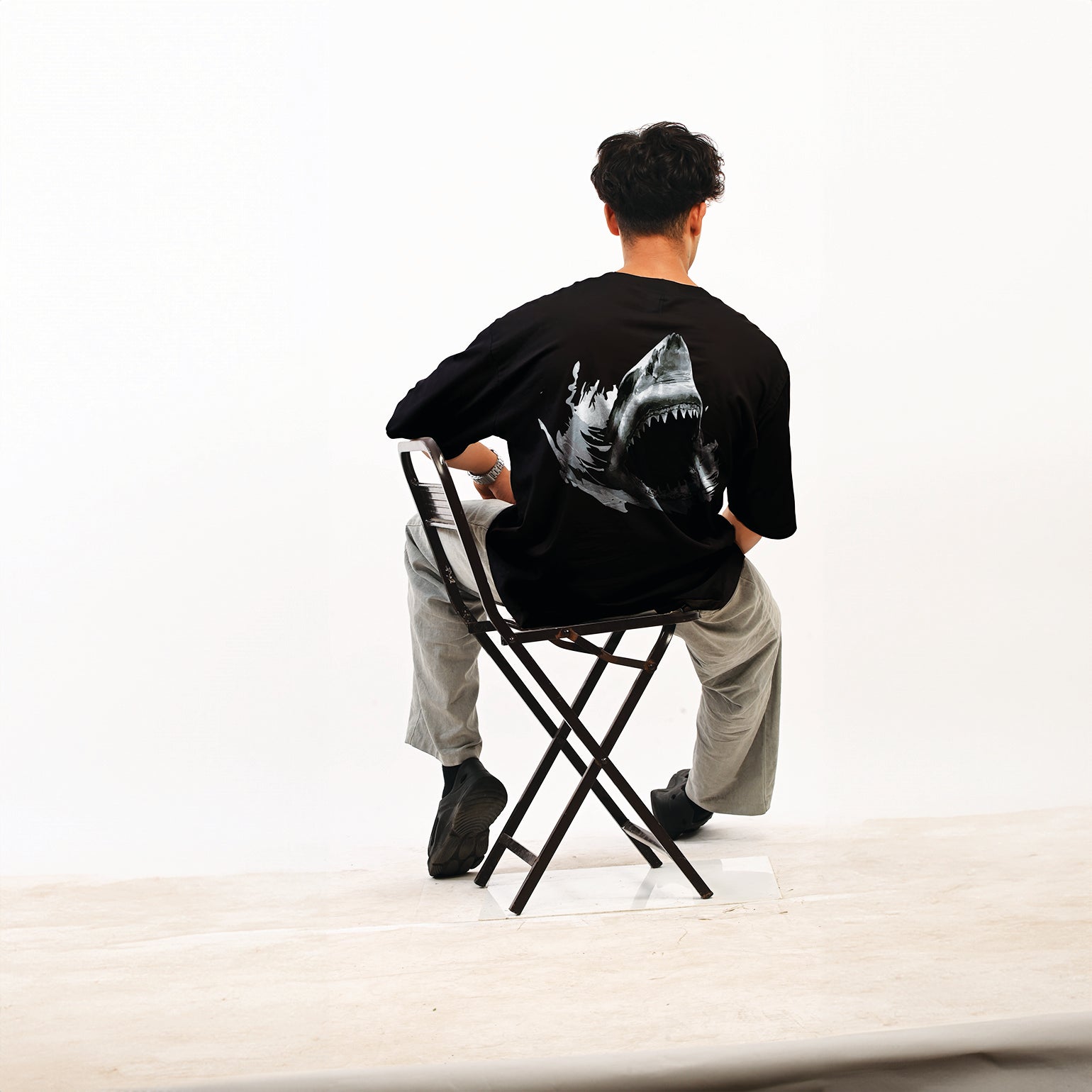 In sophisticated black, this oversized t-shirt features a striking shark design in puffed print on the back, complemented by Monkofu's exclusive branding in puffed print on the front.