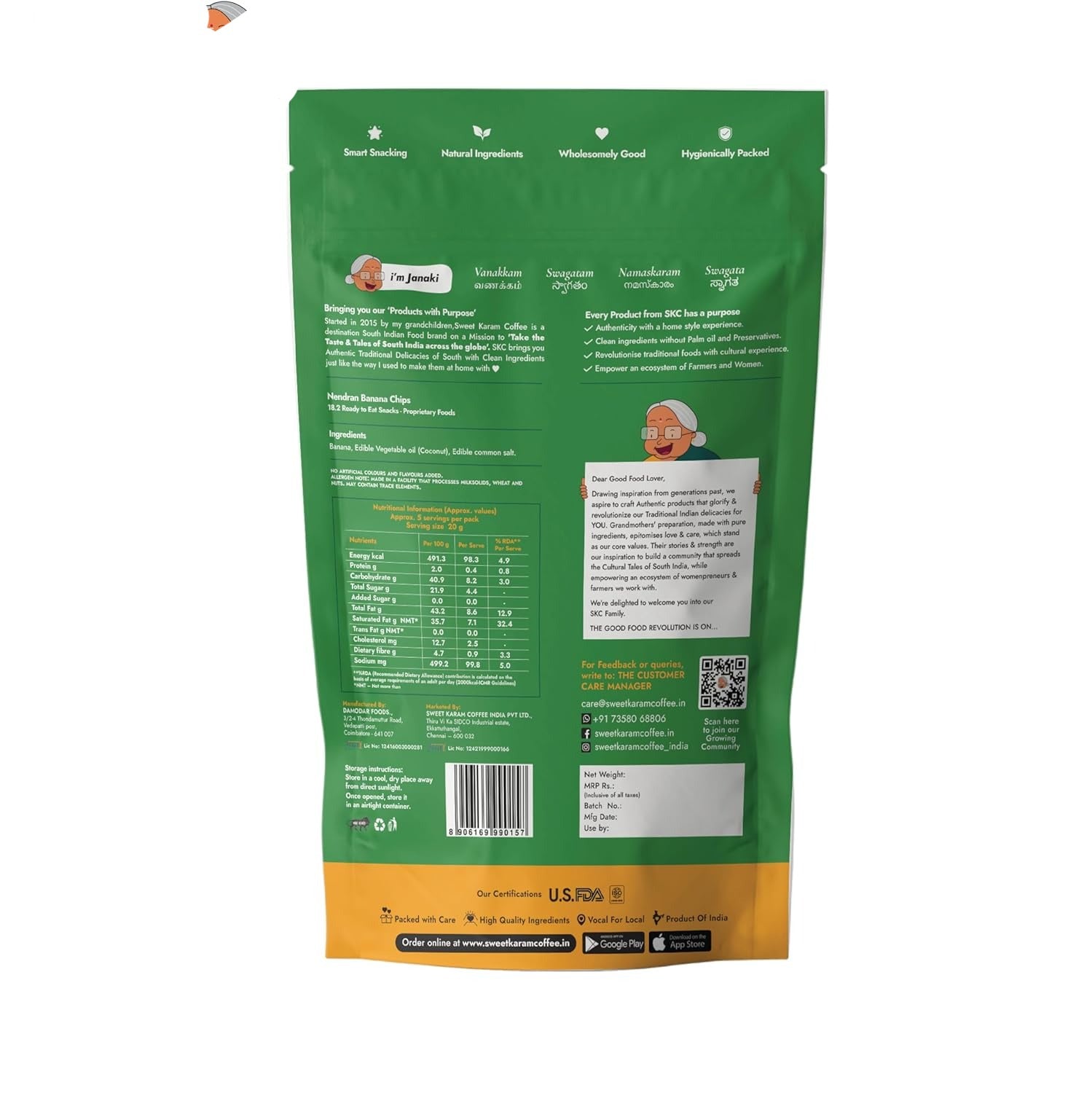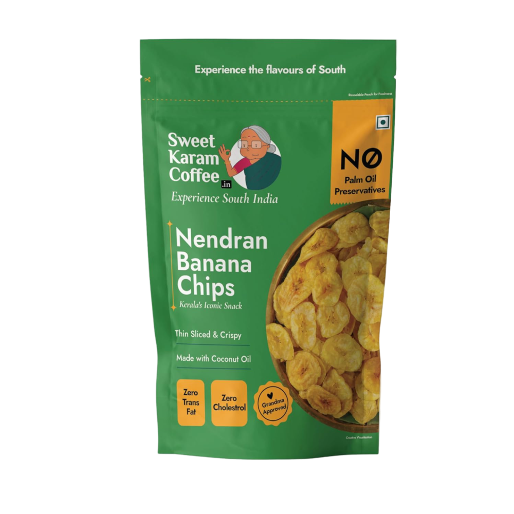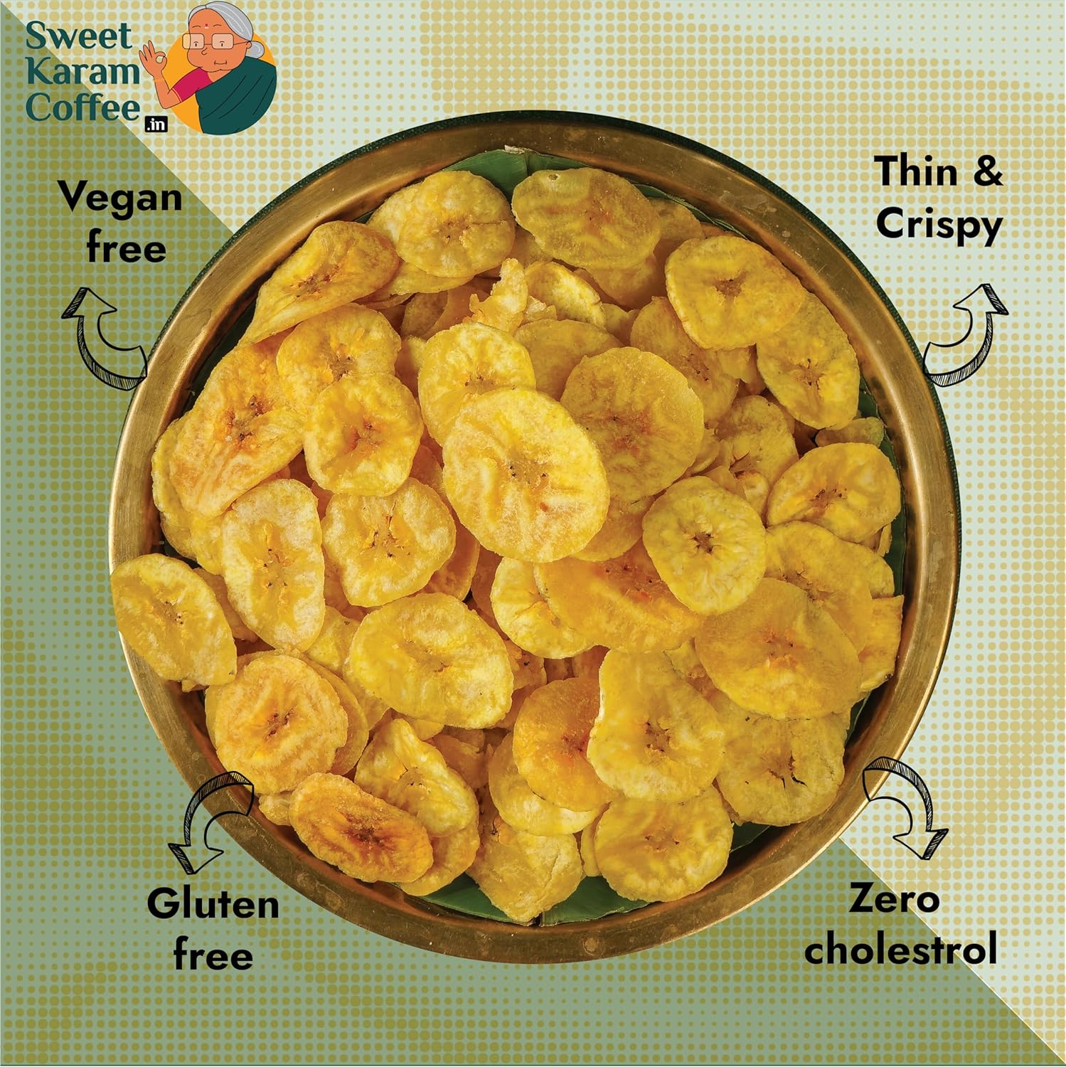 Indulge in Sweet Karam Coffee's authentic Upperi (Nendran Banana Chips) for a taste of Kerala and Nagercoil. Made with 100% coconut oil, these crunchy delights evoke the essence of coconut groves. Pair them with rasam or curd rice for a spicy twist or enjoy as a healthy snack with hot tea. Vegan, gluten-free, and with zero trans fat and cholesterol, these chips are perfect for all!