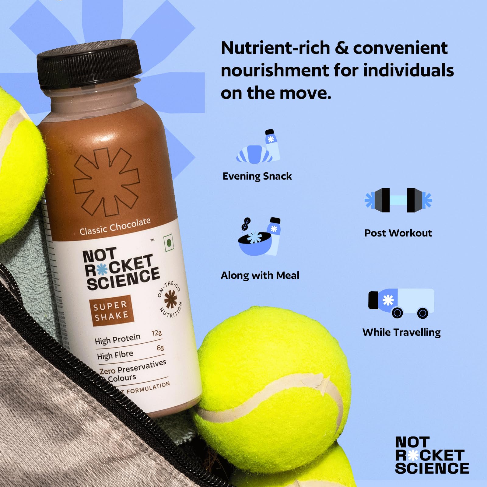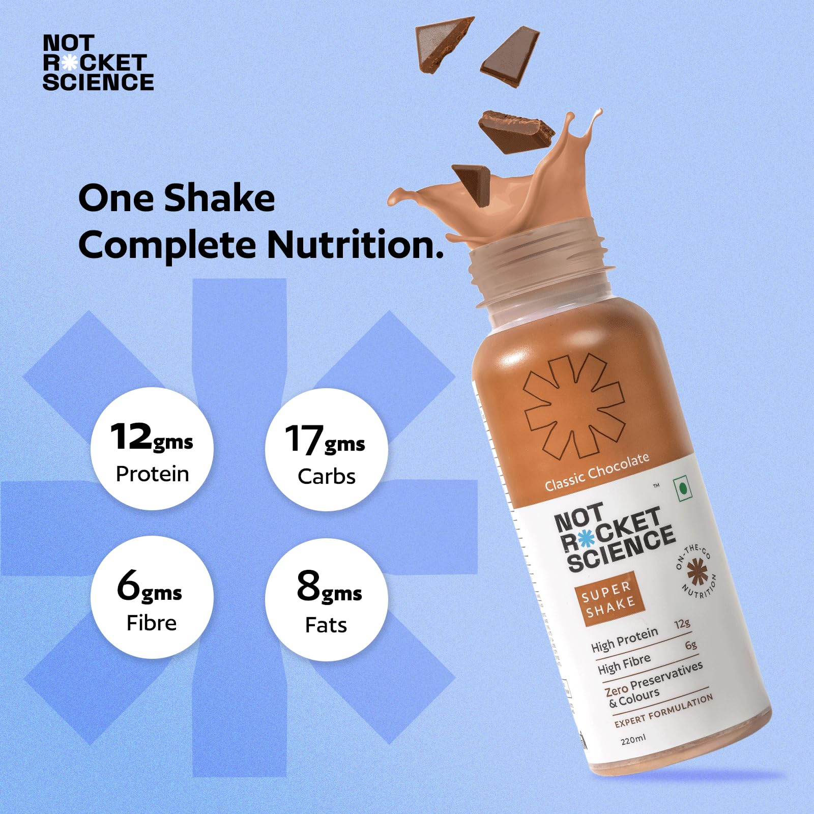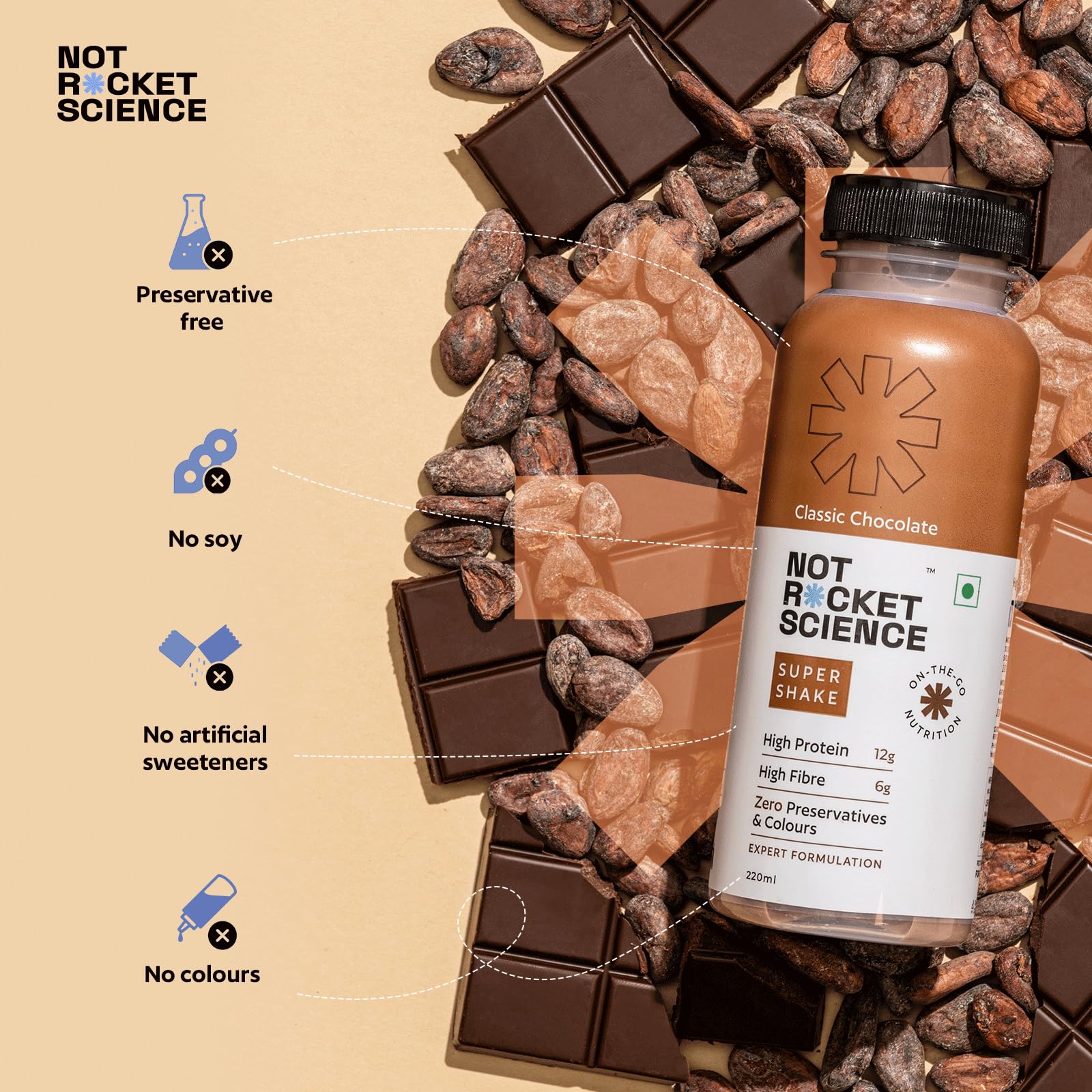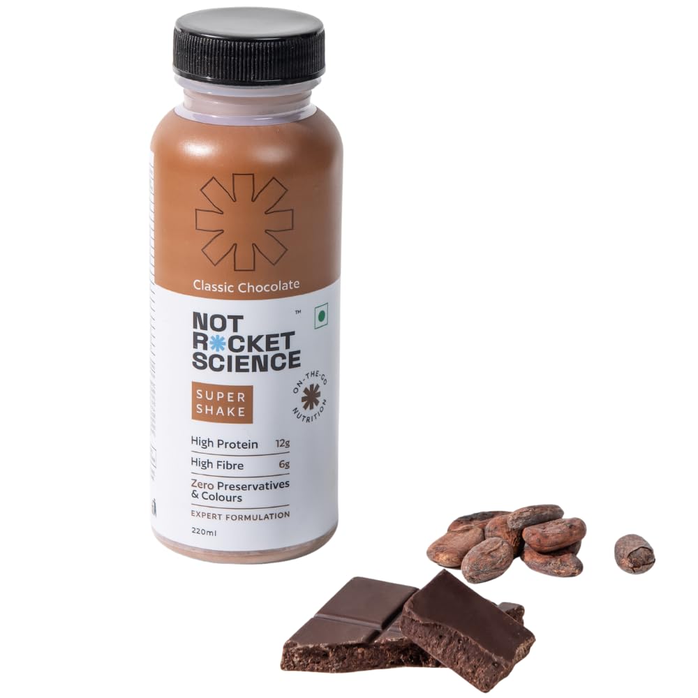 Not Rocket Science's "Classic Chocolate Super Shake" is a nutritious, fiber-rich snack with 12g Grade-A protein. Enjoy pure, premium nutrition with no preservatives or fillers, perfect for a quick, satisfying boost.