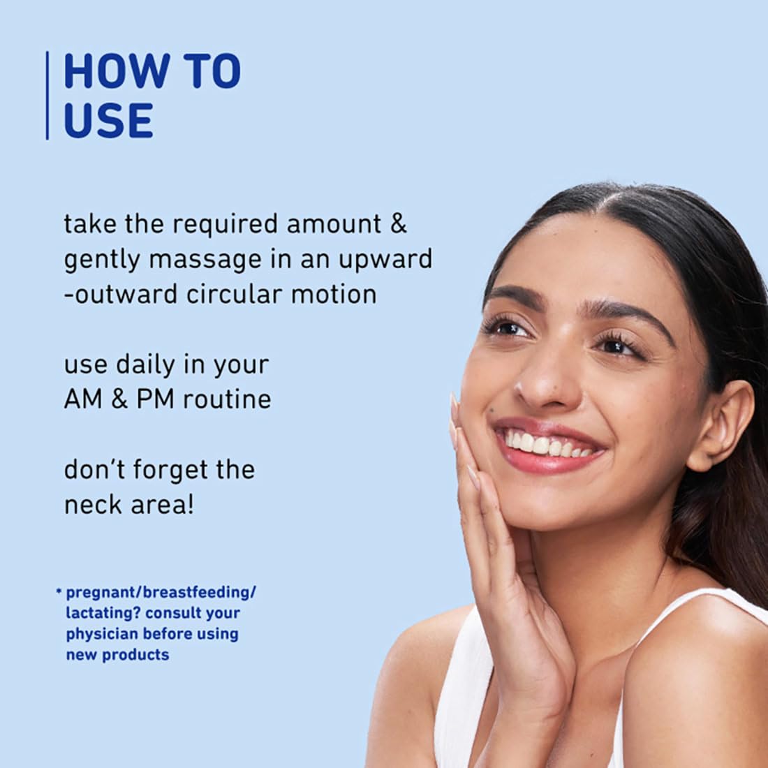 Apply evenly onto skin and gently massage with fingertips, in slow upward-outward circular motion. Don't forget the neck area