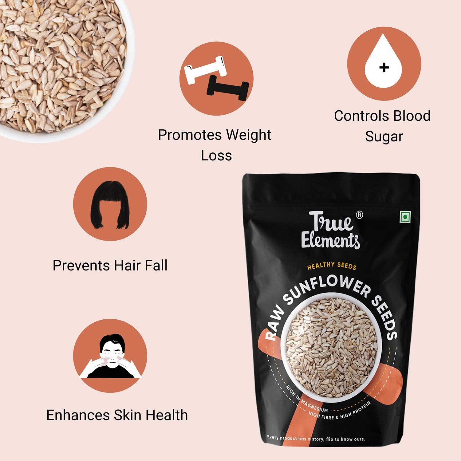 True Elements Raw Sunflower Seeds are purely natural and unprocessed, extracted from a sunflower in its pure form.