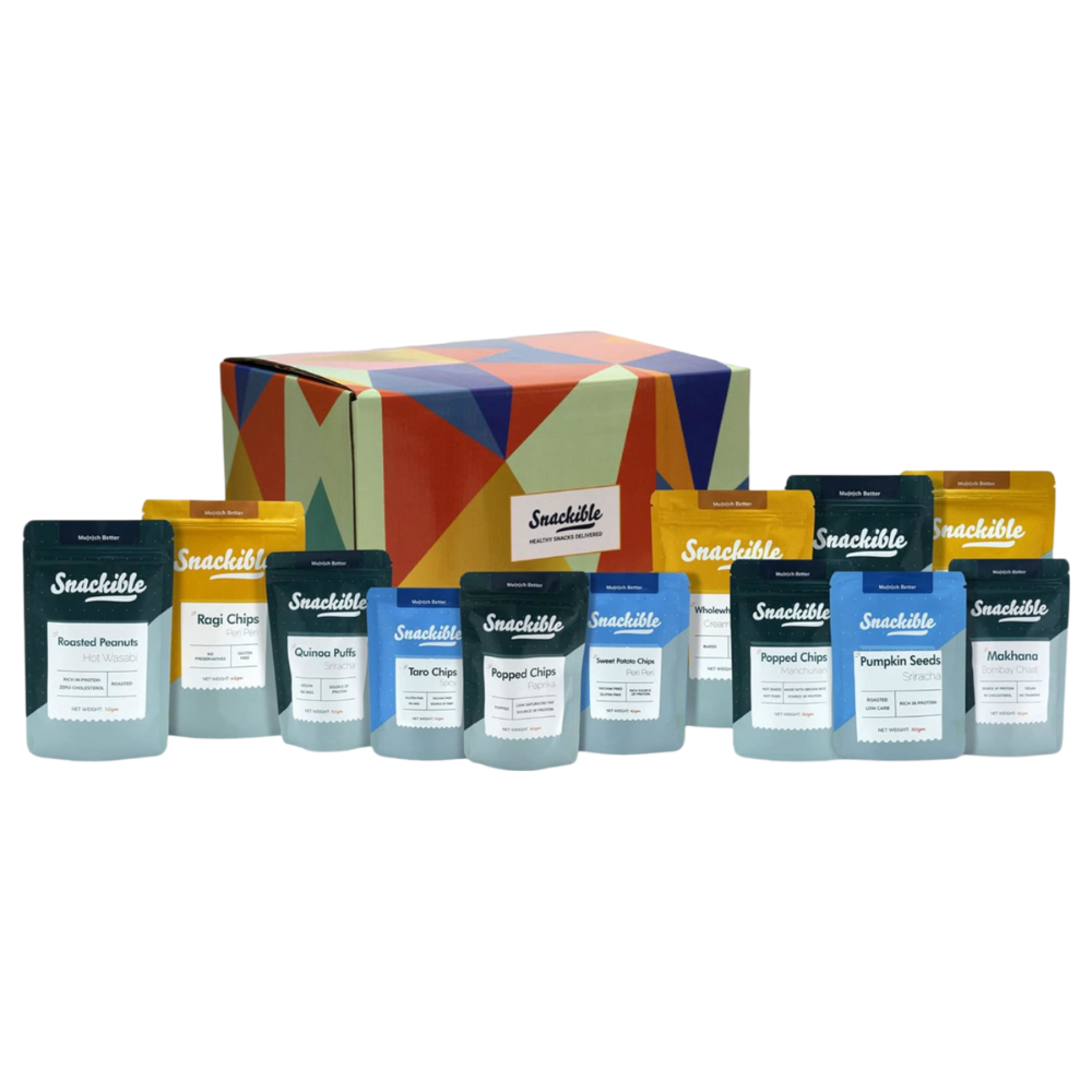 Box of 12 Savory Snacks: Includes Ragi Chips, Popped Chips, Makhanas, Veggie Chips, Seeds, Peanuts, and Puffs.