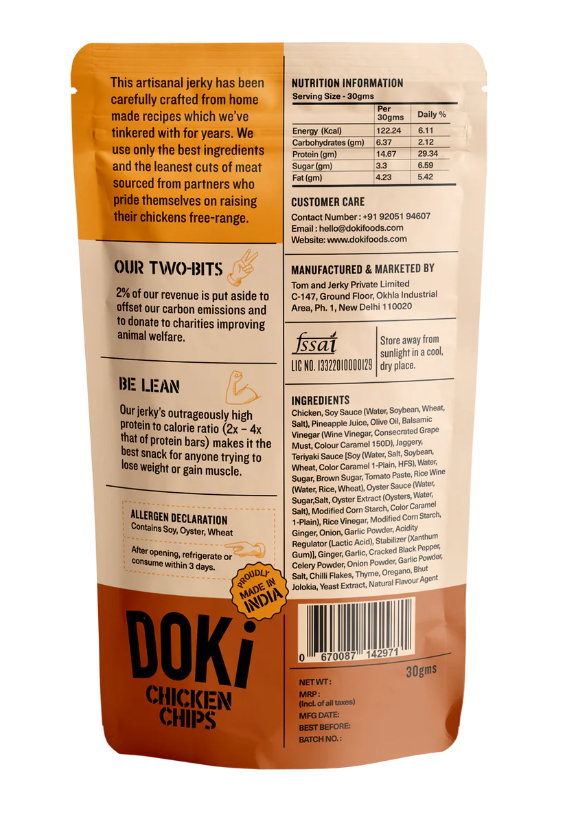 Chicken, Soy Sauce, Pineapple Juice, Olive Oil, Balsamic Vinegar, Jaggery, Teriyaki Sauce [Soy, Water, Sugar, Brown Sugar, Tomato Paste, Rice Wine, Oyster Sauce, Rice Vinegar, Modified Corn Starch, Ginger, Onion, Garlic Powder, Acidity Regulator (Lactic Acid), Stabilizer (Xanthum Gum)], Ginger, Garlic, Cracked Black Pepper, Celery Powder, Onion Powder, Garlic Powder, Salt, Chilli Flakes, Thyme, Oregano, Bhut Jolokia, Yeast Extract, Natural Flavouring Agent