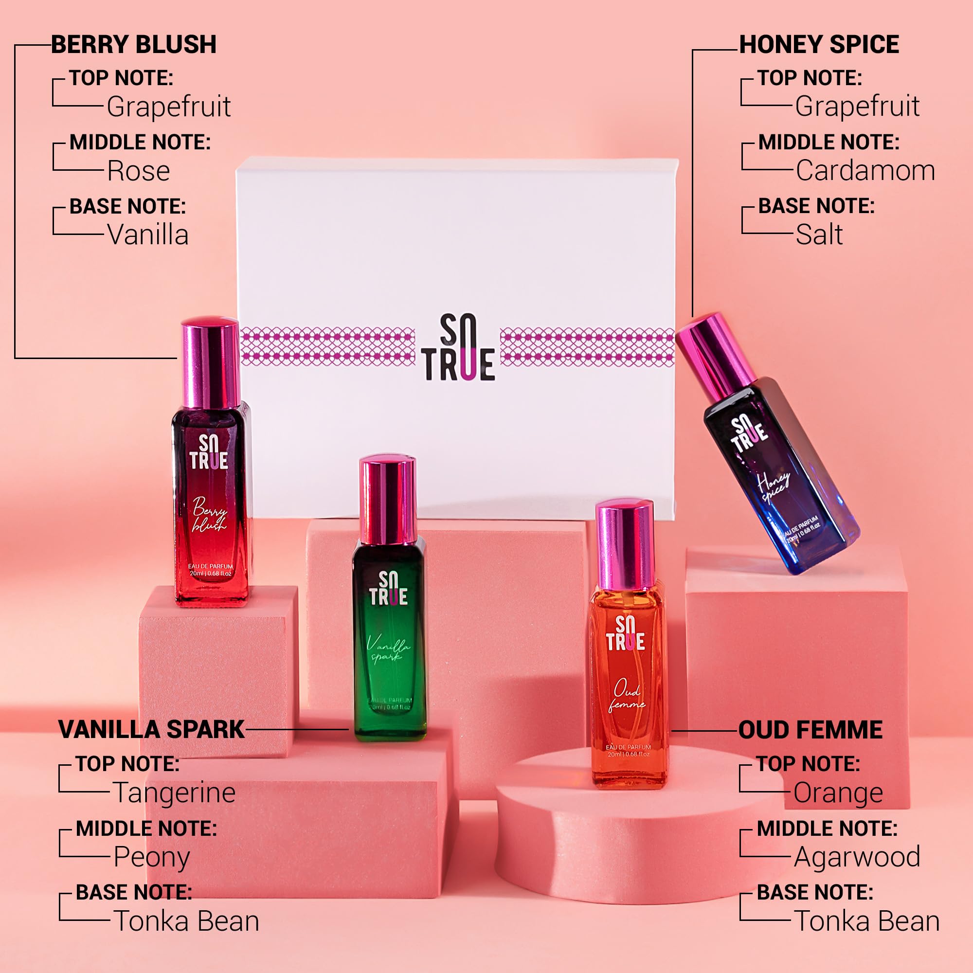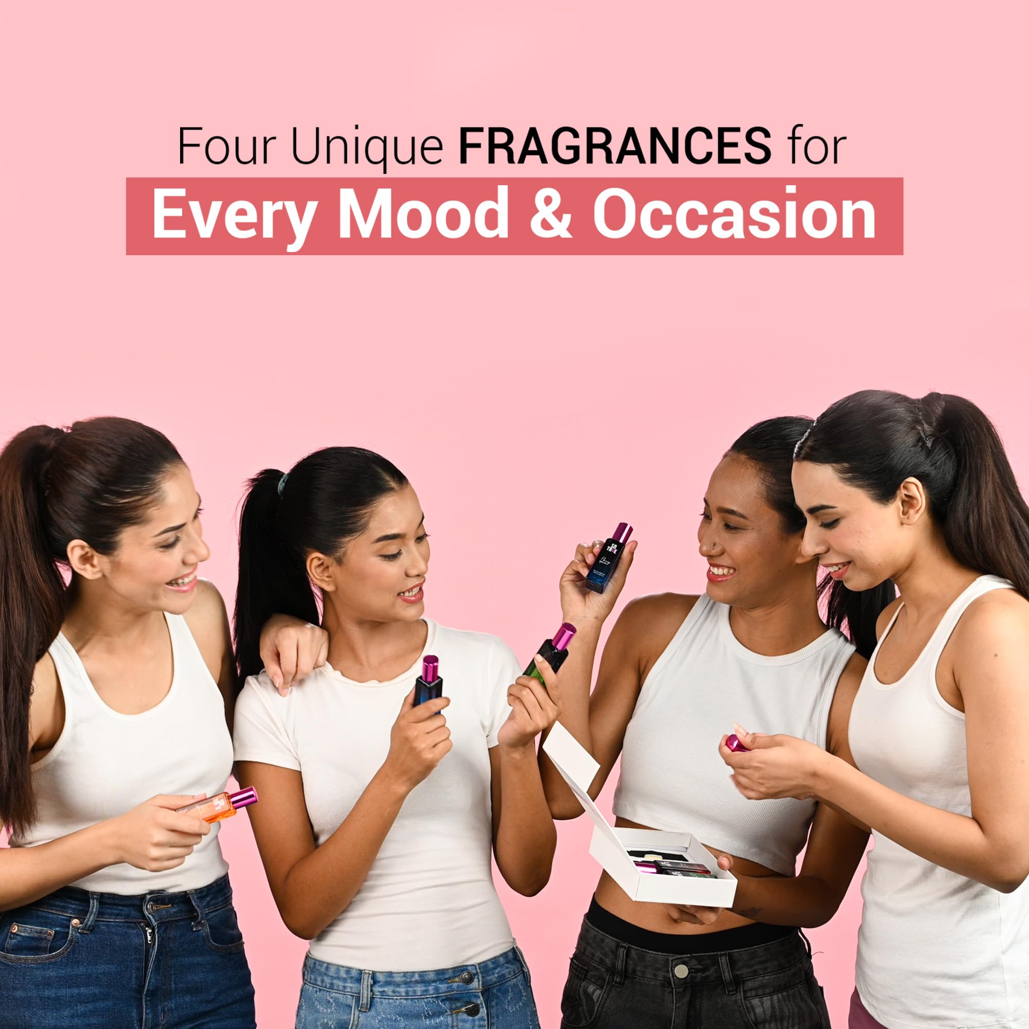 Gift-Ready: Comes as a set of 4 (Berry Blush, Honey Spice, Oud Femme, Vanilla Spark) in 20 ml bottles, making it a luxurious gift choice.