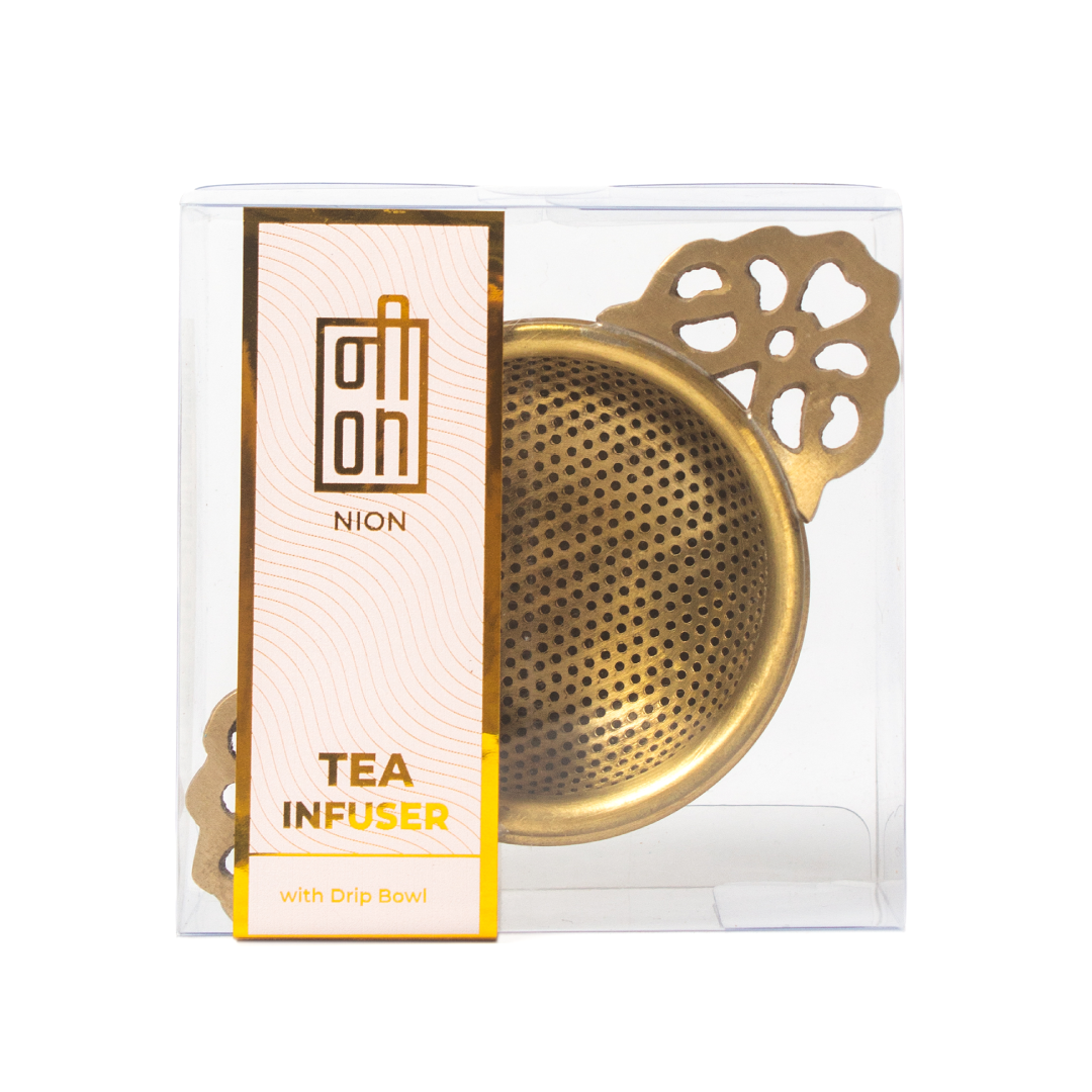Solid Brass tea strainer with ornate floral handles and a drip bowl, the perfect companion for your tea.
