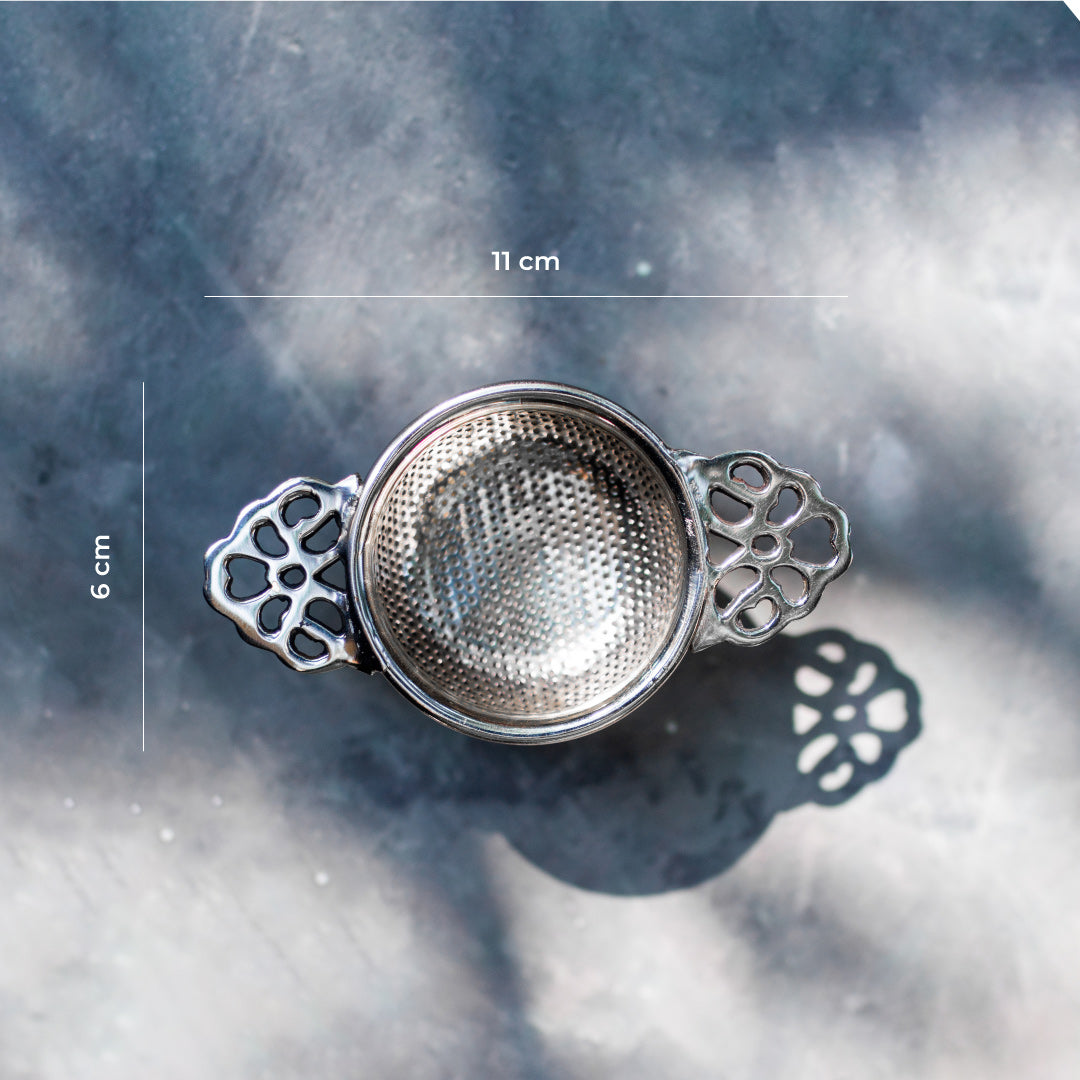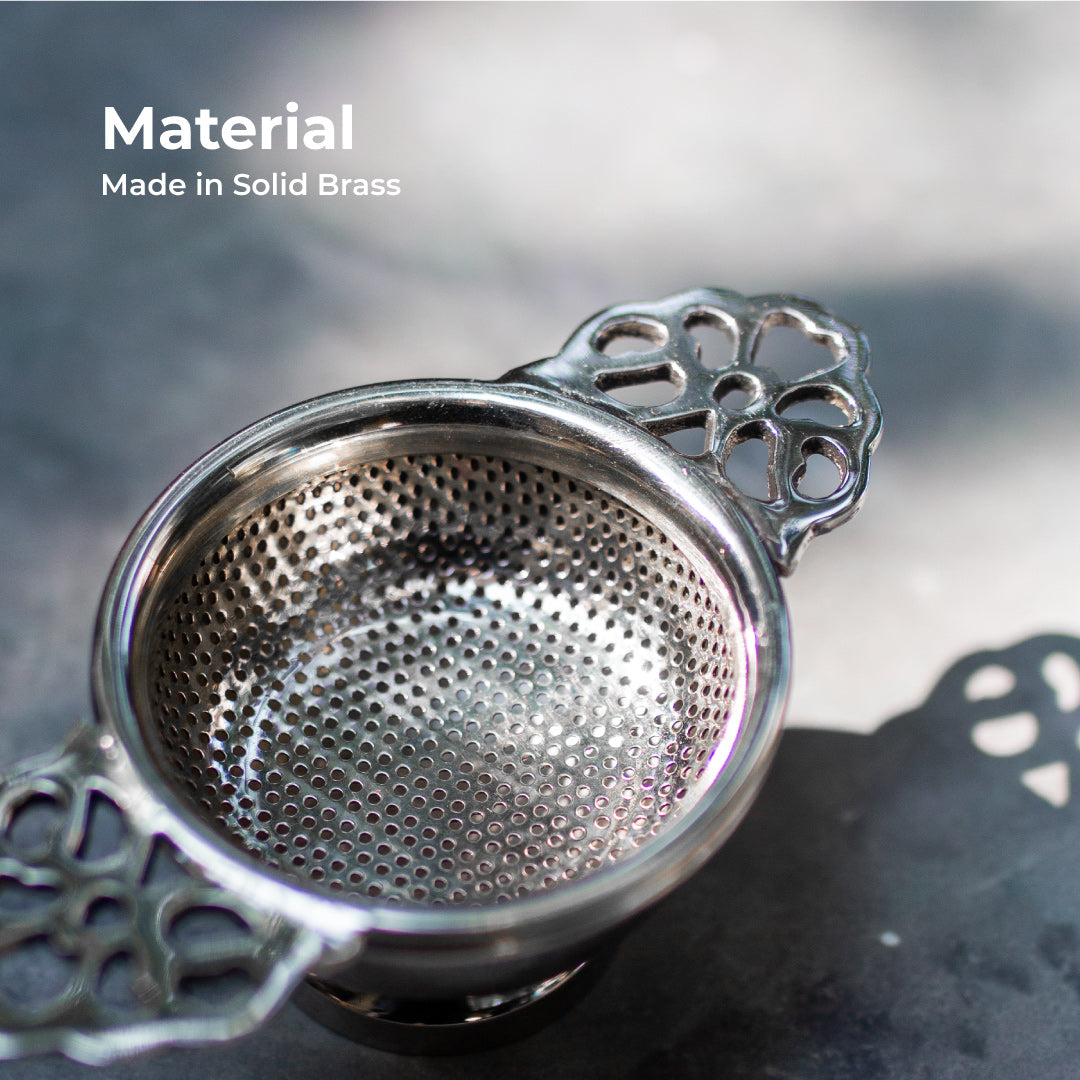 Luxurious Solid Brass tea strainer with ornate floral handles, ideal for enjoying your tea. Simply place over a cup and pour boiling water over the loose tea. After use, place the strainer on the included drip bowl. Made of Solid Brass in nickel-plated or brushed brass finish. Easy to clean with soapy water, avoid using abrasive materials.