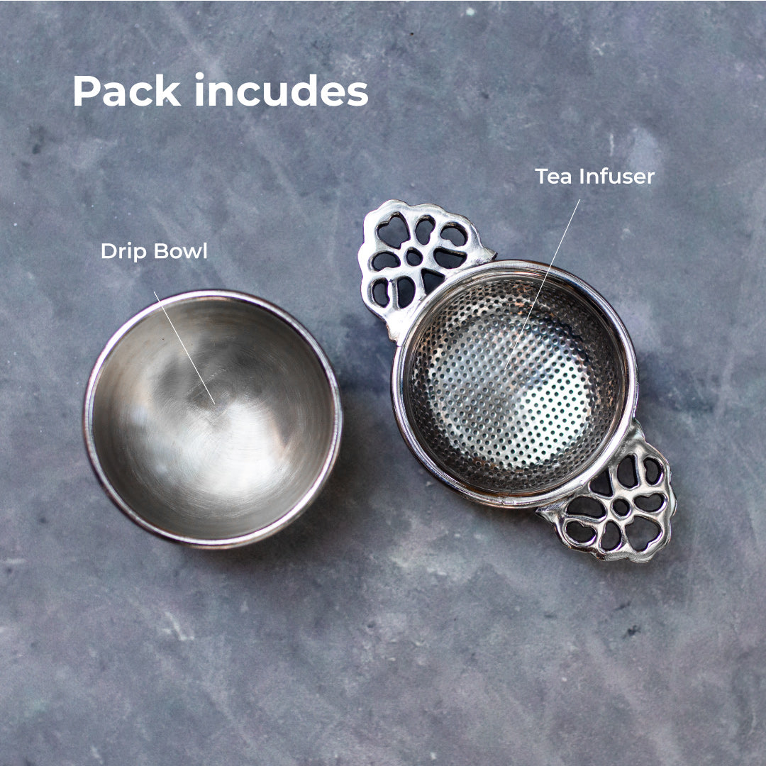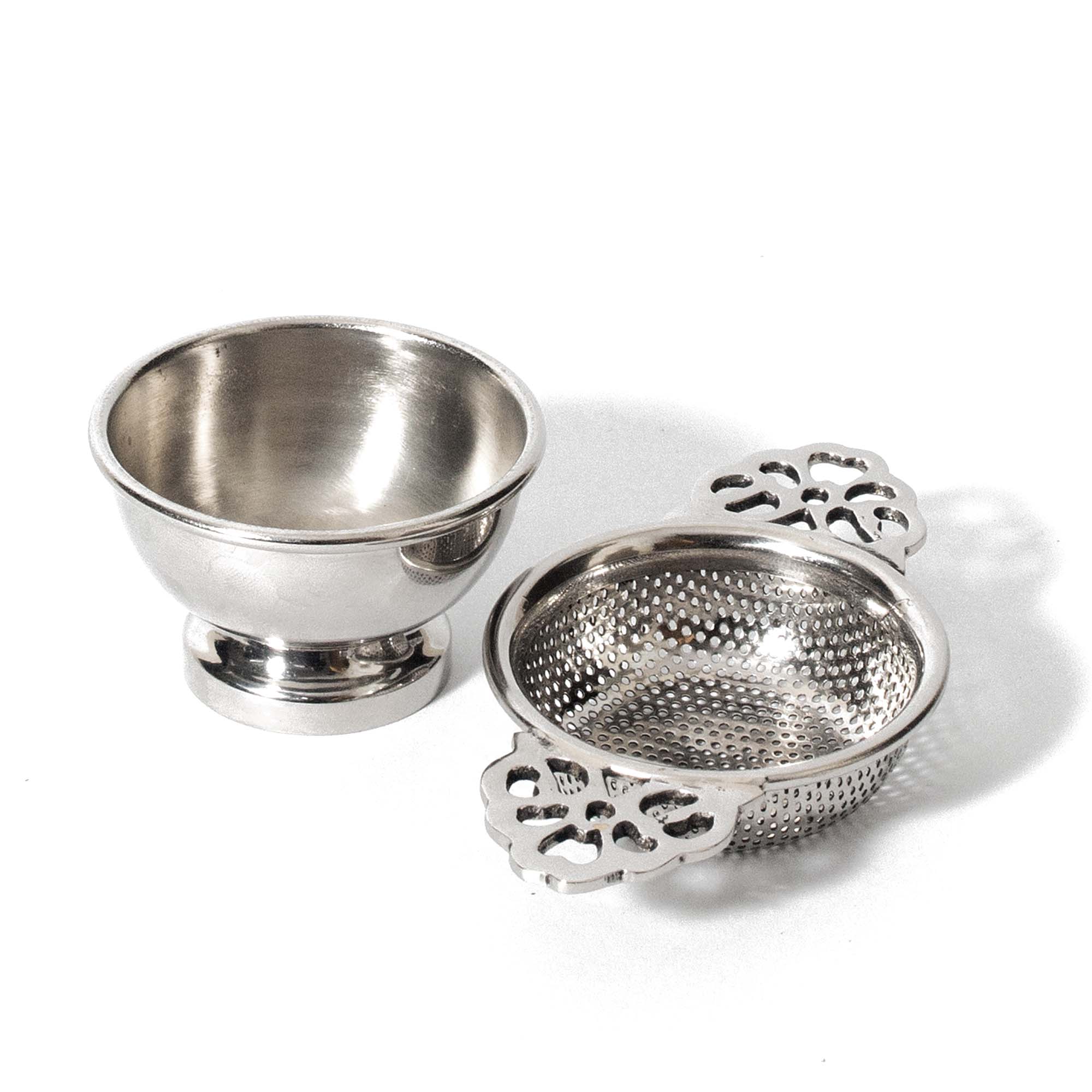 Solid Brass tea strainer with ornate floral handles and a drip bowl, the perfect companion for your tea.