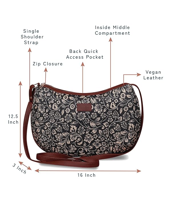 Compartments: Features main zipper compartment for wallet and accessories, two inside compartments including one small zipper for cards and important items, back chain for quick access to small accessories, cash, and coins. Soft and comfortable shoulder strap. Dimensions: 12.5 x 9 x 3 inches.