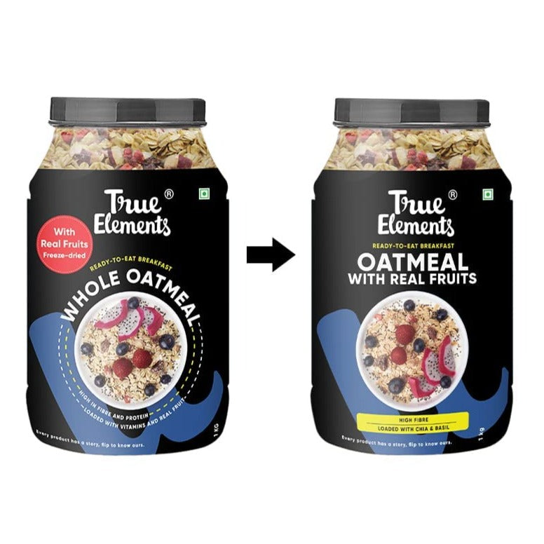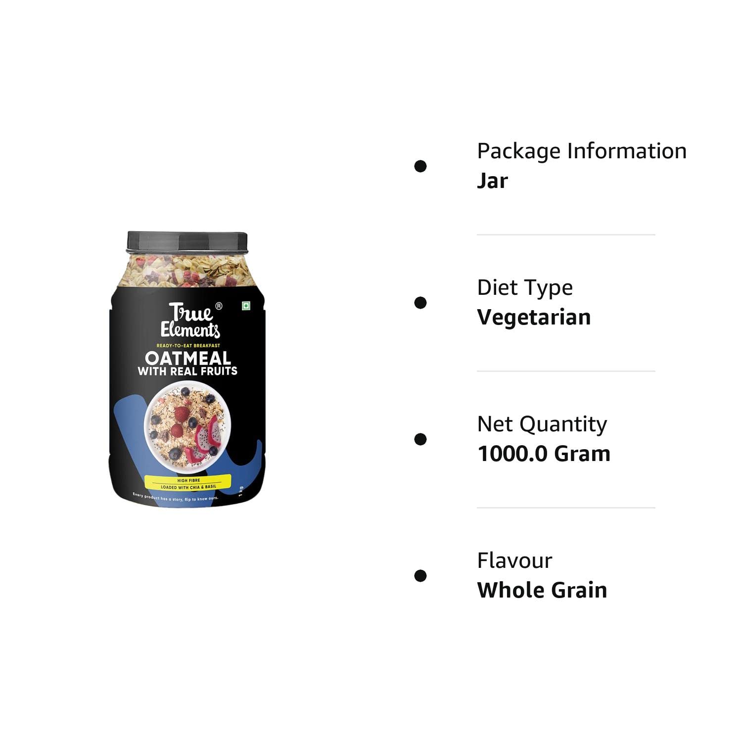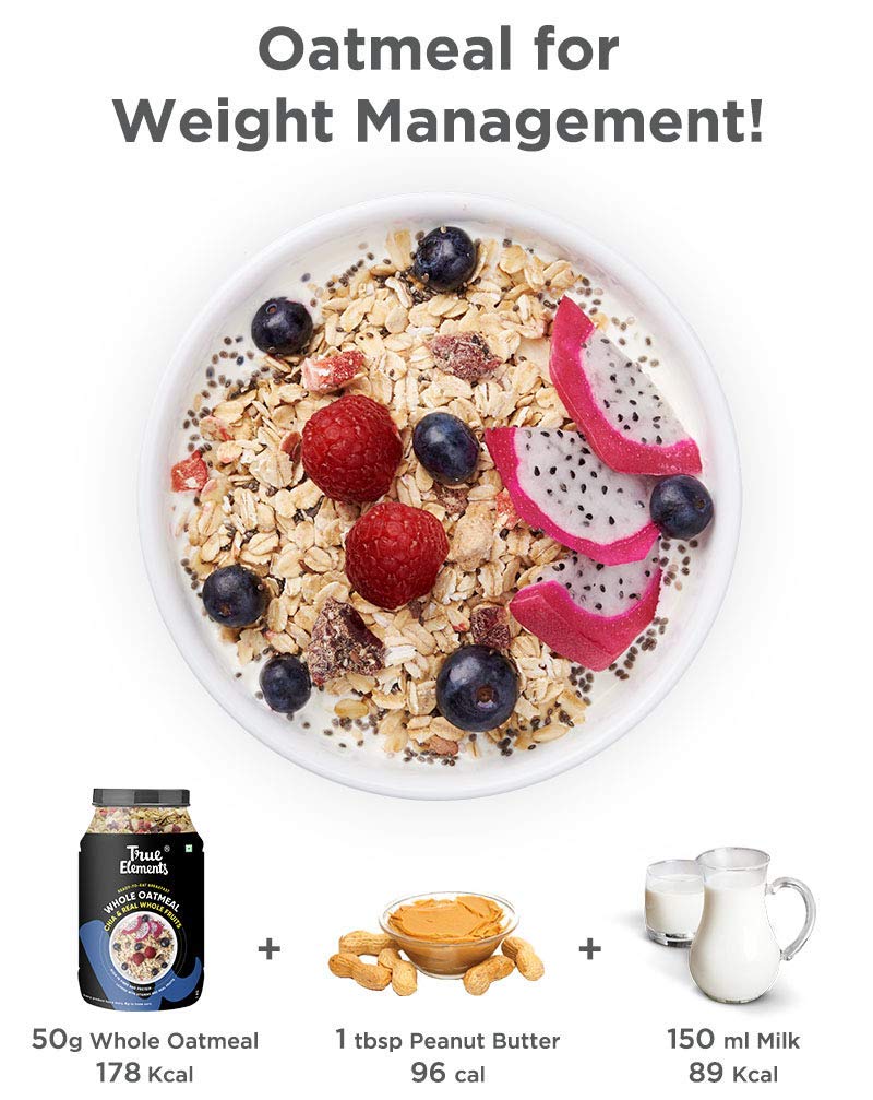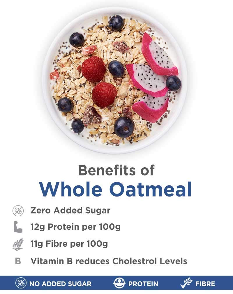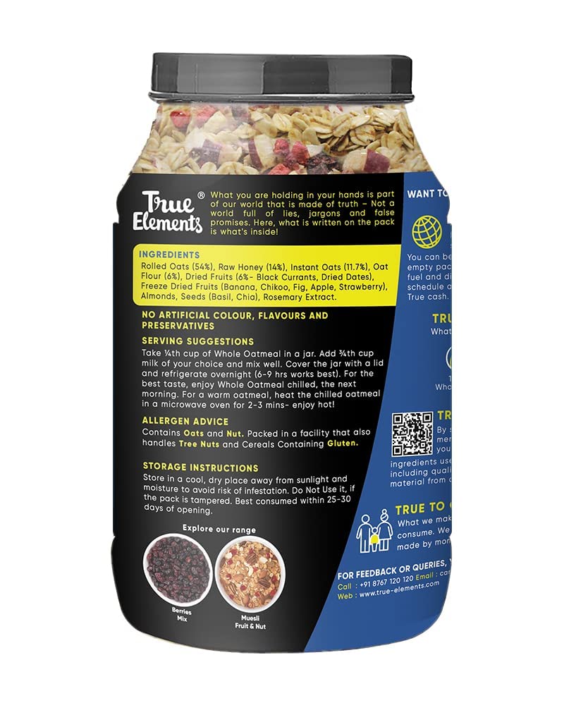 True Elements Whole Oatmeal is a storehouse of dietary fibre, protein & vitamins. A wholesome bowl of overnight wholegrain oatmeal made from vitamin-rich oats can be relished with chilled milk blended with real fruits & nuts that can provide you with the required energy & can keep your hunger pangs at bay. In addition to the crunchy, wholegrain rolled oats, our oatmeal is filled with fresh, juicy fruits which are freeze-dried without a single layer of sugar over it, unlike dehydrated fruits. Packed with protein, a cool, soothing jar of oatmeal with chia can give you the required energy to sustain throughout the day. Enjoy your whole oatmeal for breakfast.