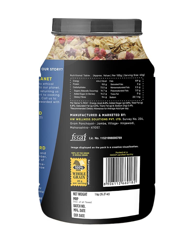 Rolled Oats (54%), Raw Honey (14%), Instant Oats (11.7%), Oat flour (6%), Dried Fruits (6%- Blackcurrants, Dried Dates), Freeze Dried Fruits (Banana, Chikoo, Fig, Apple, Strawberry), Almonds, Seeds (Basil, Chia), Rosemary Extract.