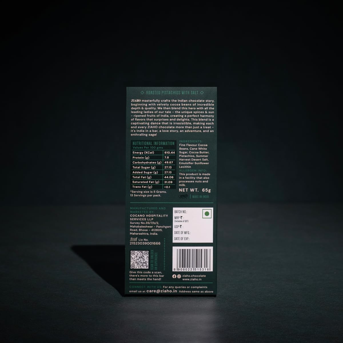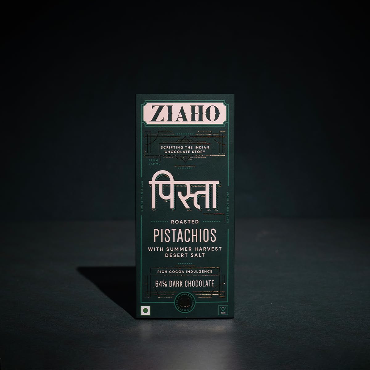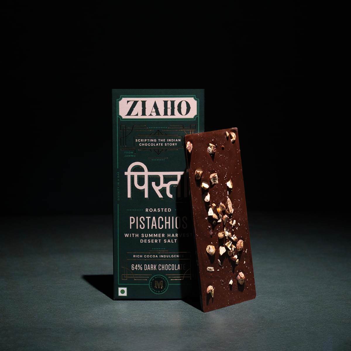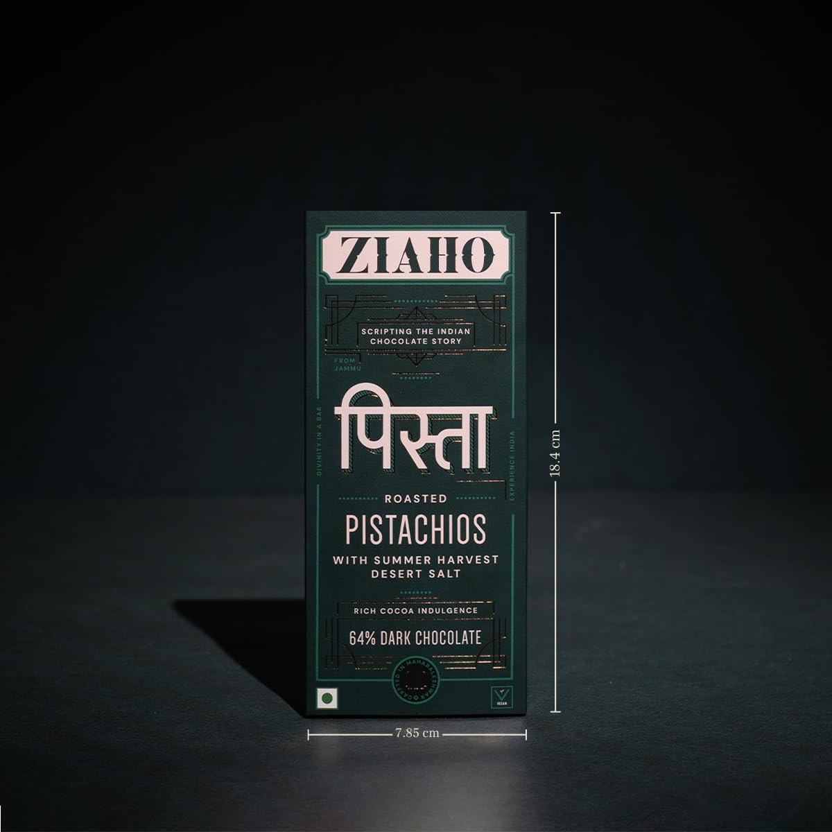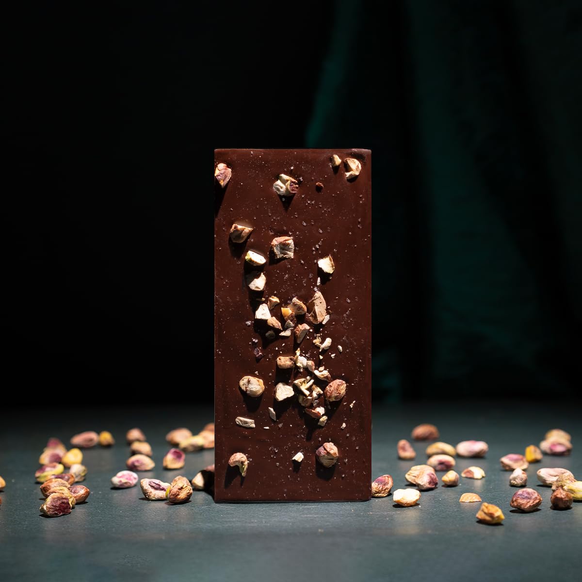 Expertly crafted dark chocolate bar with 64% cocoa content, pistachios from Jammu, and summer-harvested desert salt from Rajasthan. Guaranteed to satisfy both taste and conscience.