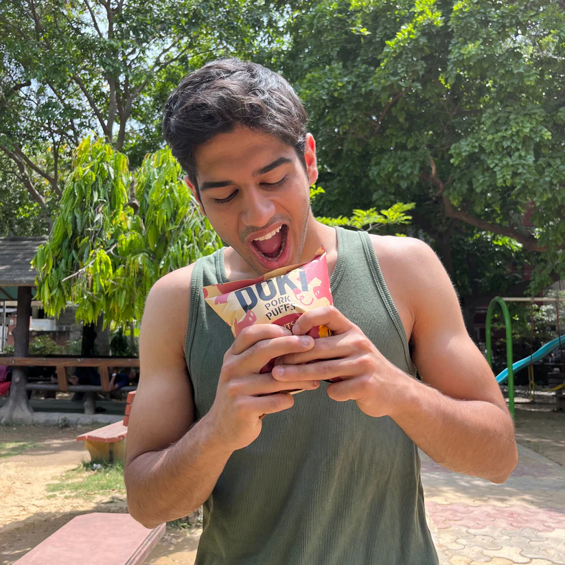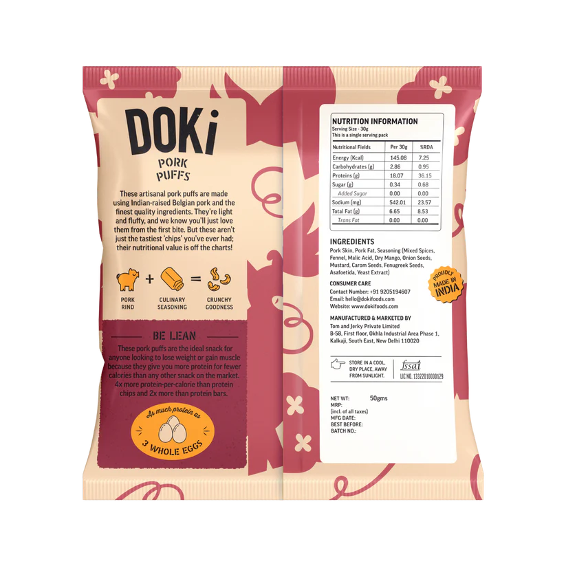 Pork Skin, Pork fat, seasoning (Mixed spices, fennel,malic acid, dry mango, onion seeds, mustard, carom seeds, fenugreek seeds, Asafoetida, yeast extract)