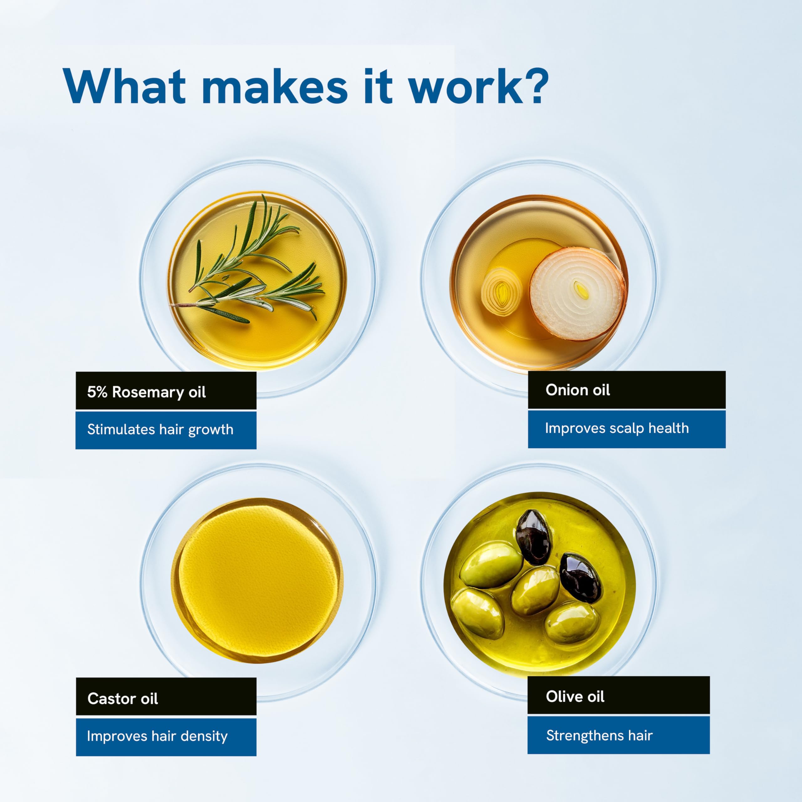 • STIMULATES HAIR FOLLICLES: This hair growth oil features a robust 5% rosemary extract, renowned for its ability to stimulate hair follicles, improve circulation in the scalp, and promote stronger, healthier hair growth.