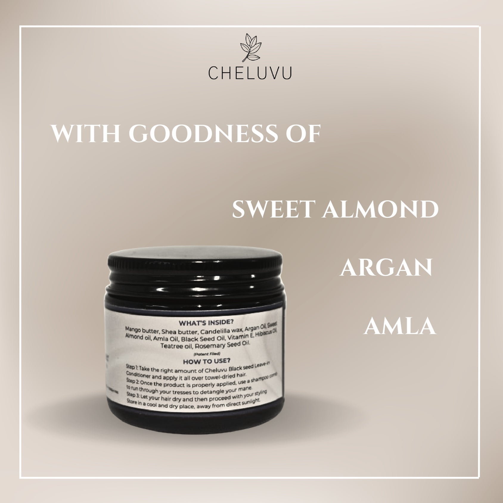 Mangifera Indica (Mango Butter), Vitellaria Paradoxa (Shea Butter), Euphorbia Antisyphilitica (Candelilla Wax) Argania Spinosa (Argan Oil), Prunus Amygdalus Dulcis (Sweet Almond Oil), Emblica Officinalis (Amla Oil), Nigella Sativa (Black Seed Oil), Tocopherol (Vitamin E), Hibiscus Sabdariffa (Hibiscus Oil), Melaleuca Alternifolia (Tea Tree oil), Rosmarinus Officinalis (Rosemary Oil)