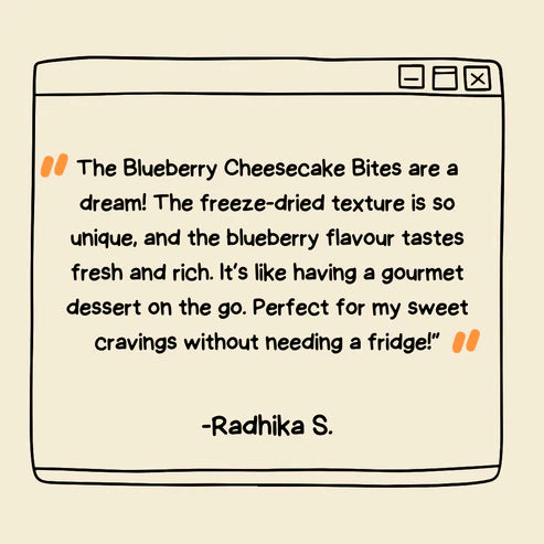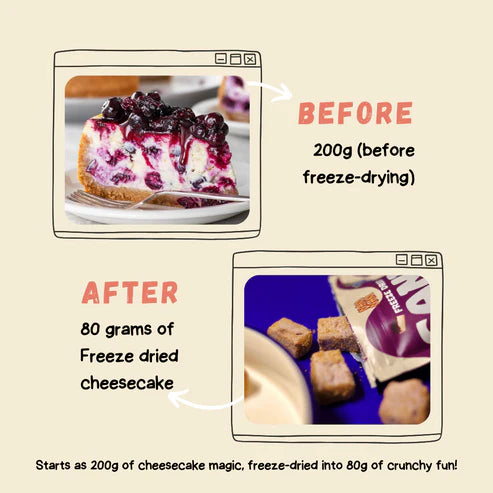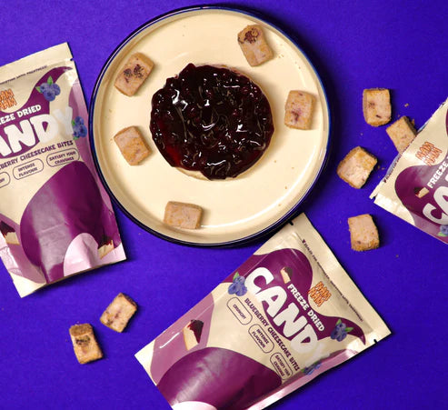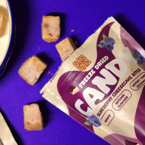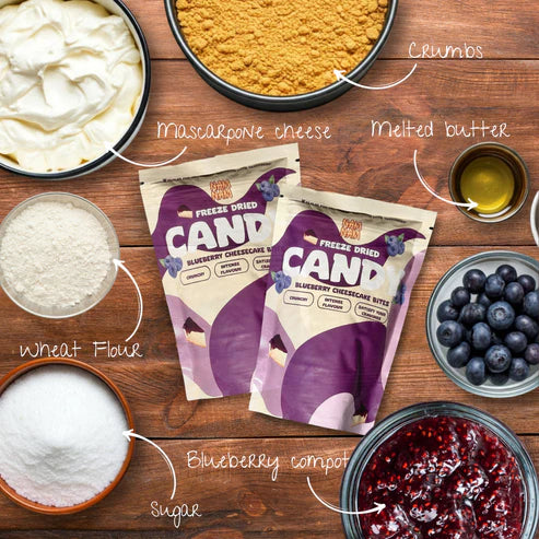 Satisfy your taste buds with our delectable freeze-dried Blueberry Cheesecake bites.