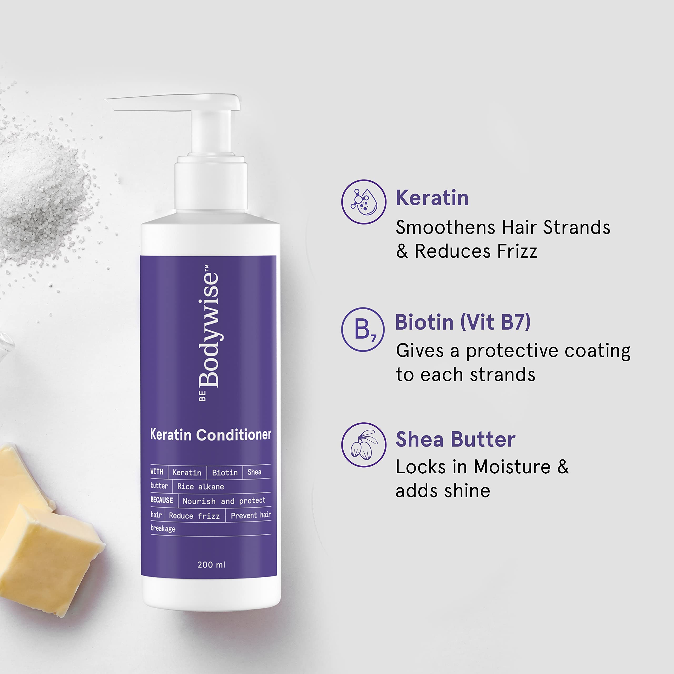 • Bodywise Keratin Conditioner, Paraben & Sls Free, Reduces Frizz, Locks In Moisture, Keratin, Silk Protein, Biotin & Shea Butter, 200 Millilitre - All