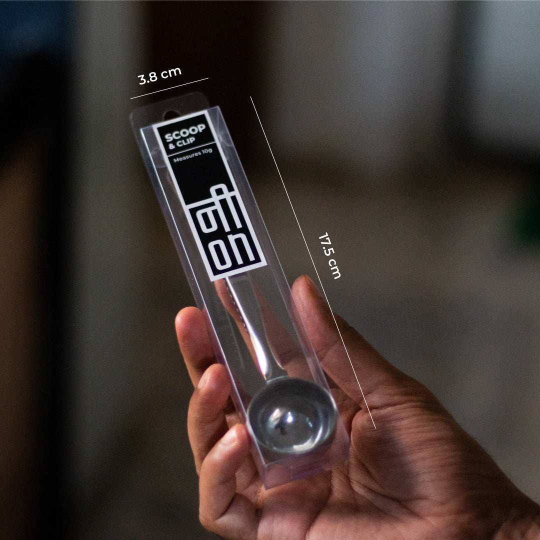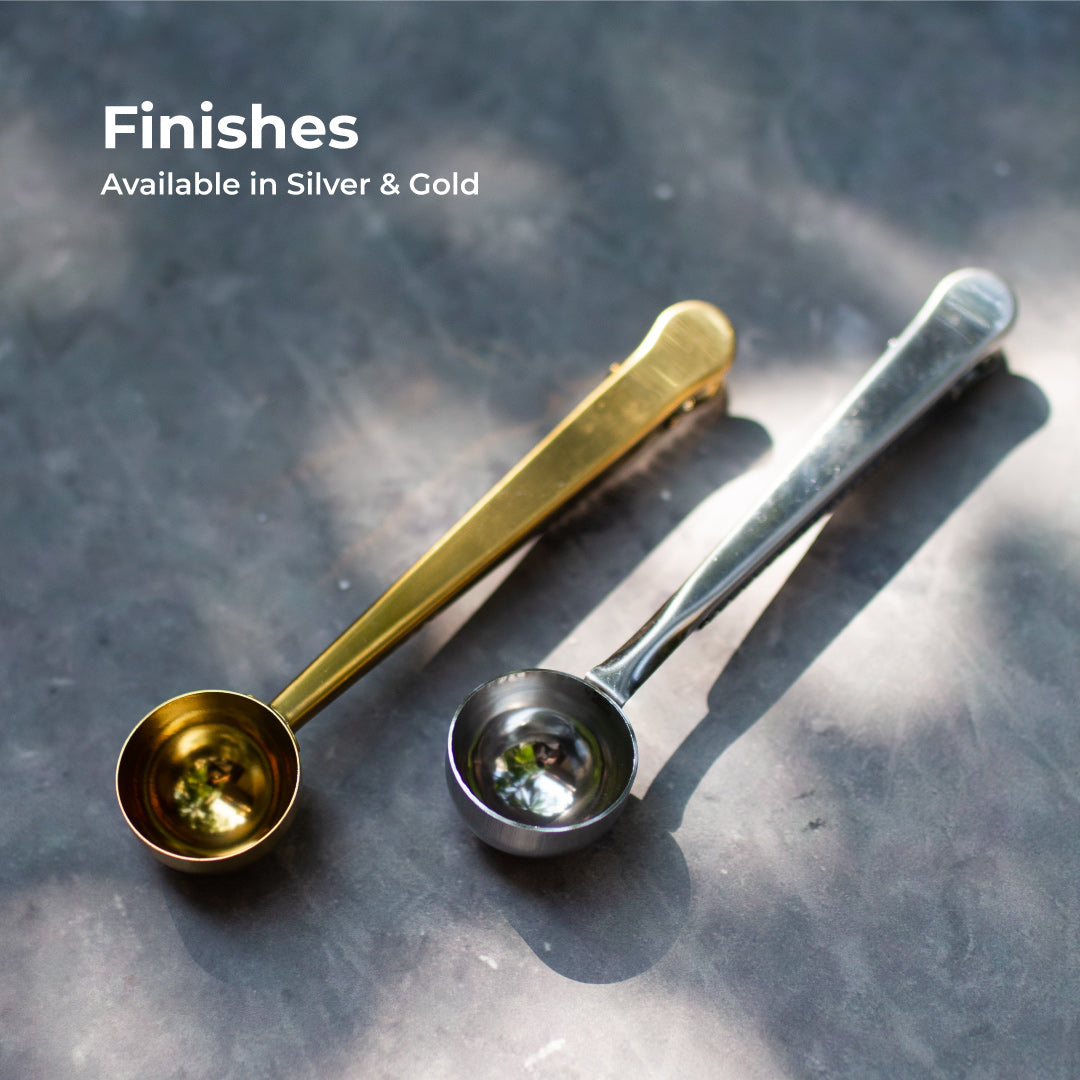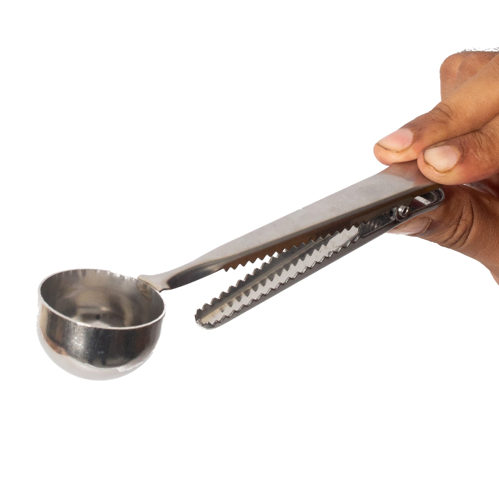 Never lose your coffee scoop - this clip doubles as a seal to keep your coffee fresh and ready to use. Made with durable food-grade stainless steel and comes with two scoops for one cup of coffee. Conveniently handwash with soap and water. DIMENSIONS: 17.5 x 3.8 x 2.5 cm.