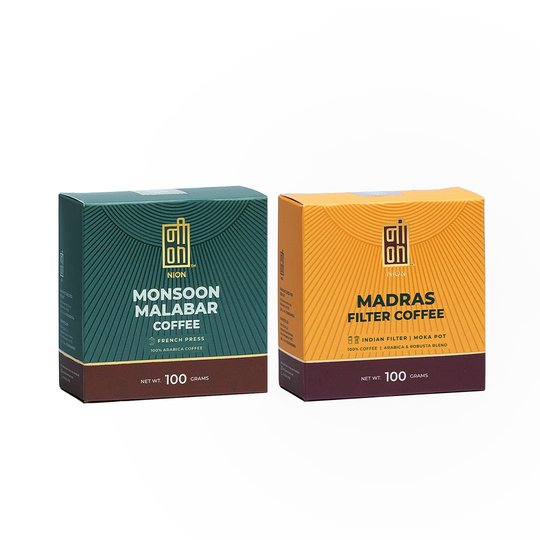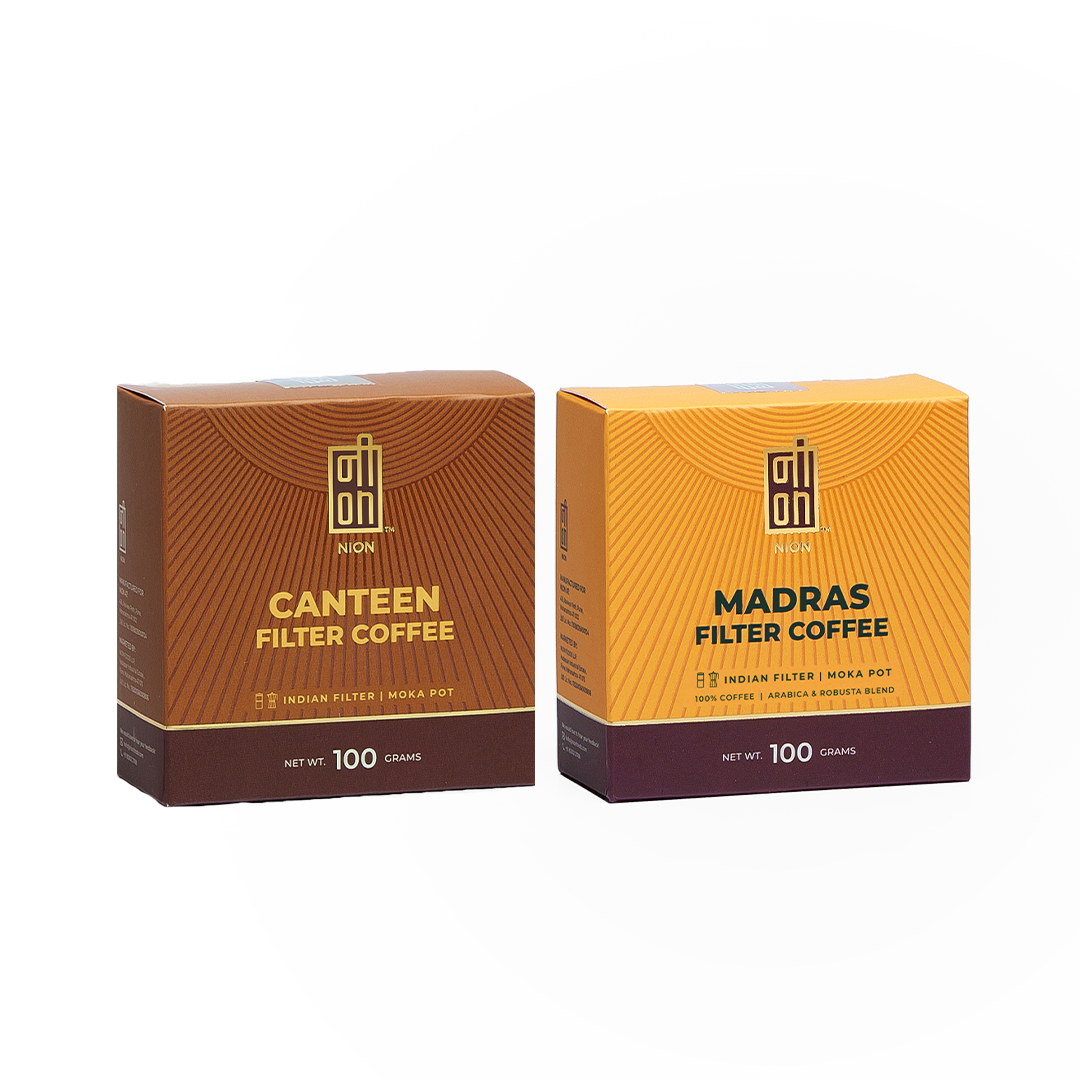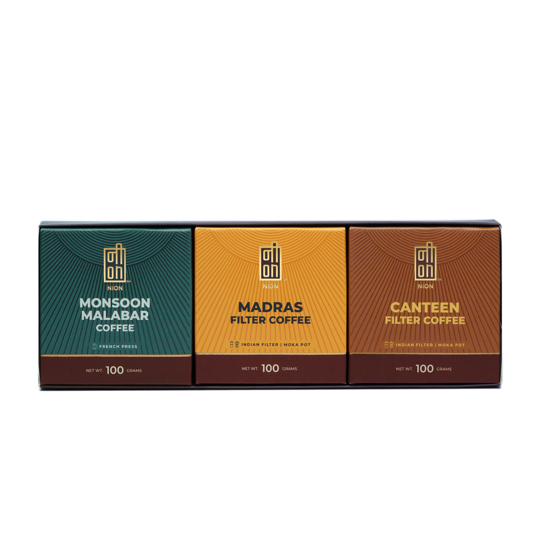 Experience our trio of ground coffees, each showcasing unique flavors and aromas. Includes 3 blends: a South Indian Filter and Moka Pot option with Arabica, Robusta, and Chicory; a blend for French Press with 100% Arabica; and a Madras Filter for South Indian Filter and Moka Pot. Each pack makes 8+ servings.