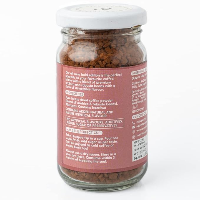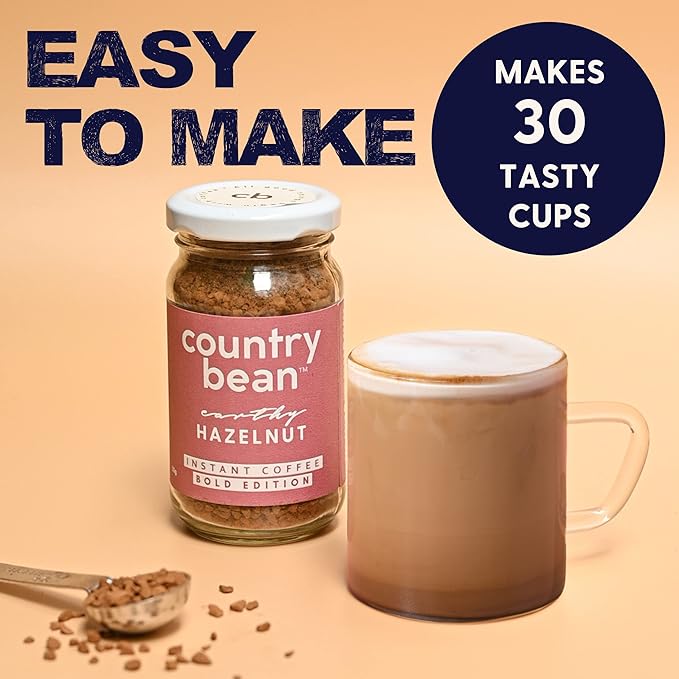 • Grown in the hills of Coorg, our Hazelnut instant arabica coffee has a smooth, nutty flavour and a strong, creamy finish that lingers on your tastebuds and lets you enjoy a cafe-like experience at home.