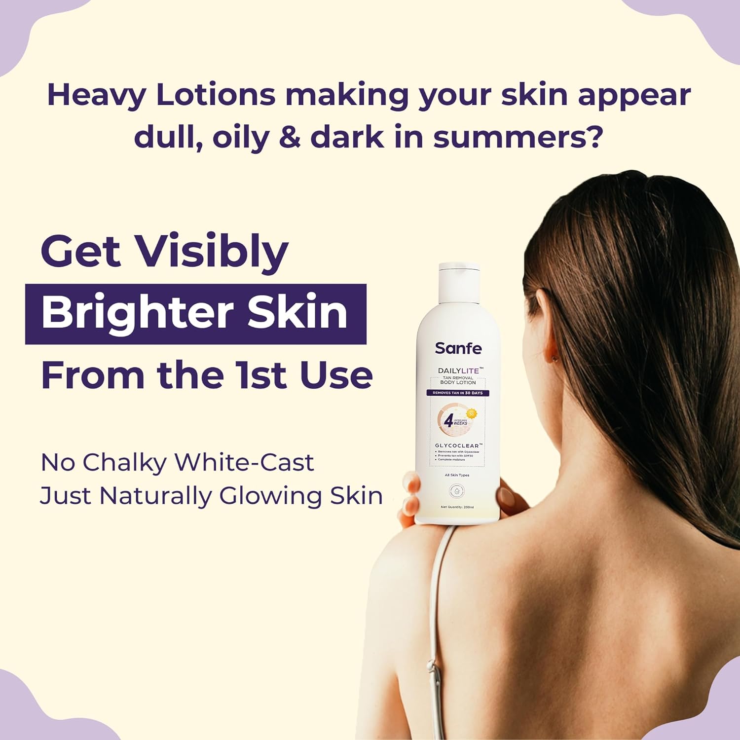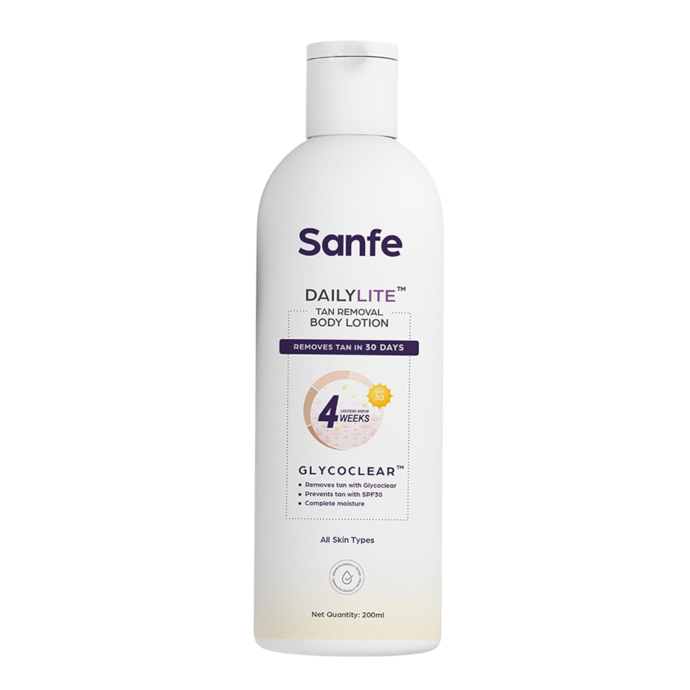 Sanfe DailyLite Tan Removal Body Lotion for Women removes Tan in 30 days. It absorbs into the skin very easily and has a soft matte finish. This Detan Pack has a Glycoclear Technology that helps in lightening and brightening the skin.