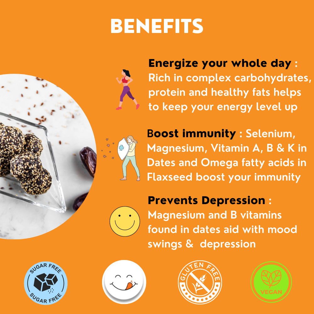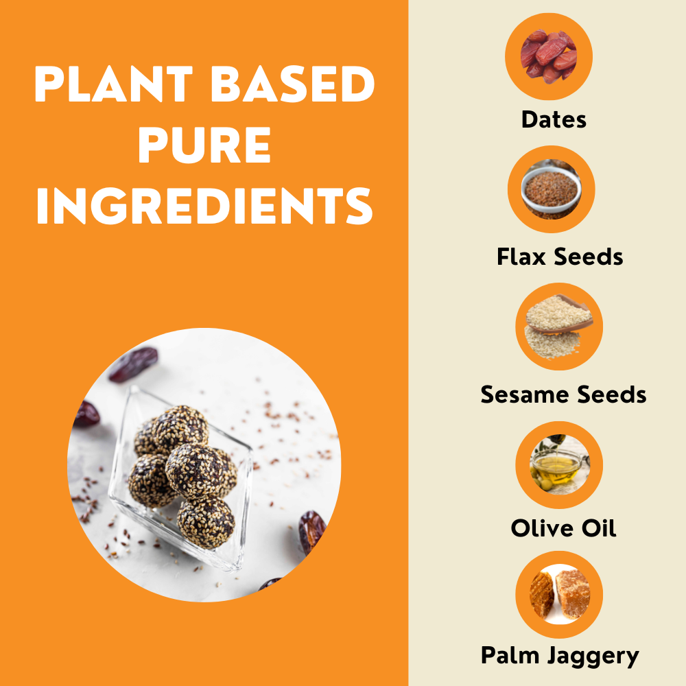 Made with nature's candy, dates, omega-3-rich flaxseeds, and nutrient-packed sesame seeds, sweetened with low GI palm jaggery and enriched with extra virgin olive oil, each laddoo offers sustained energy and essential nutrients.