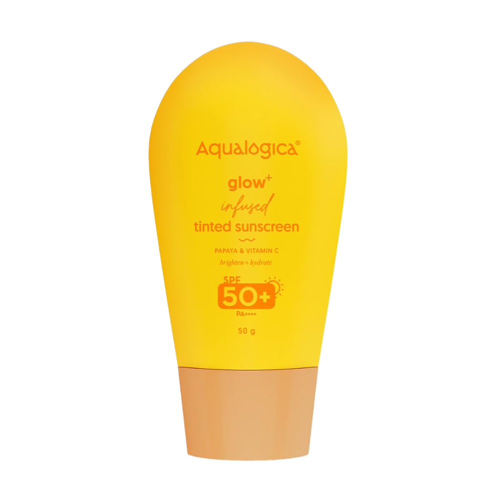 Introducing Glow+ Infused Tinted Sunscreen by Aqualogica! Universally flattering tint, Papaya, Vitamin C, Hyaluronic Acid for tone, hydration, glow. SPF 50+, PA++++ protection. No white cast, featherlight texture. Your skin's new favourite!