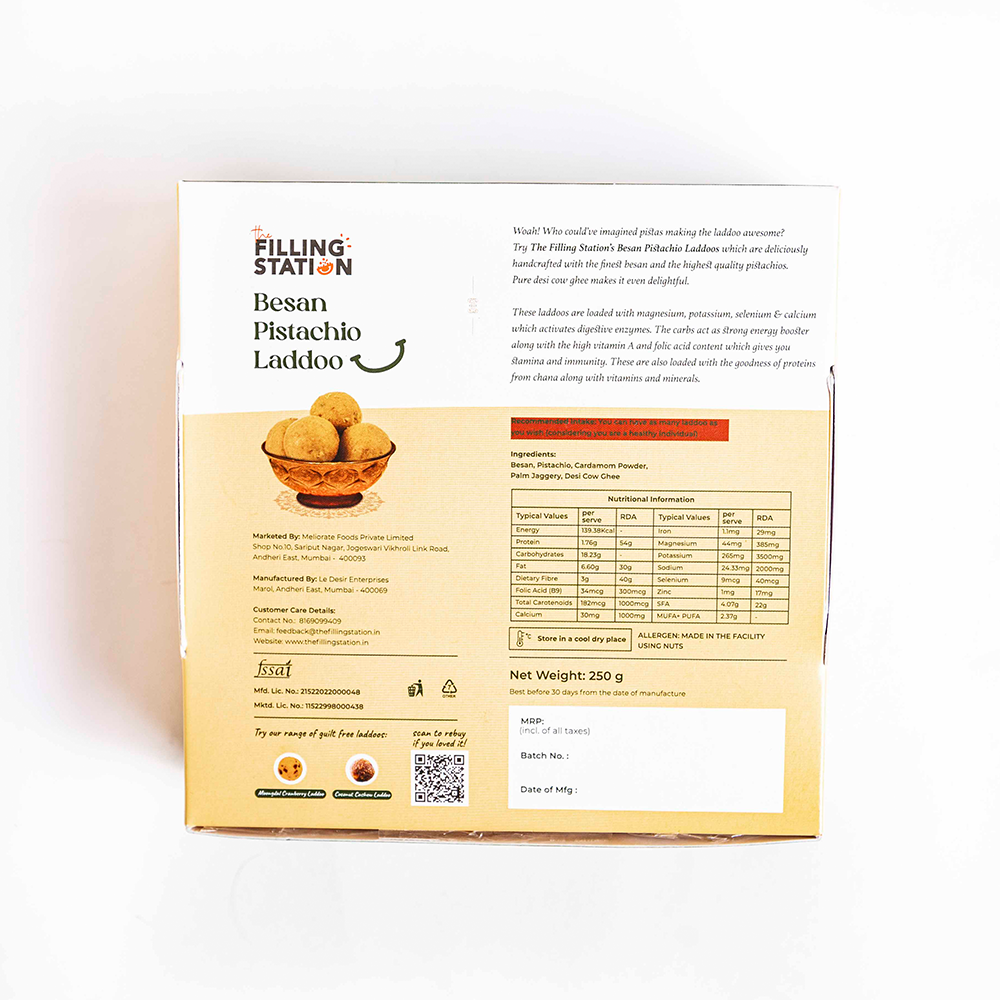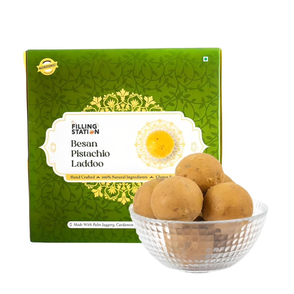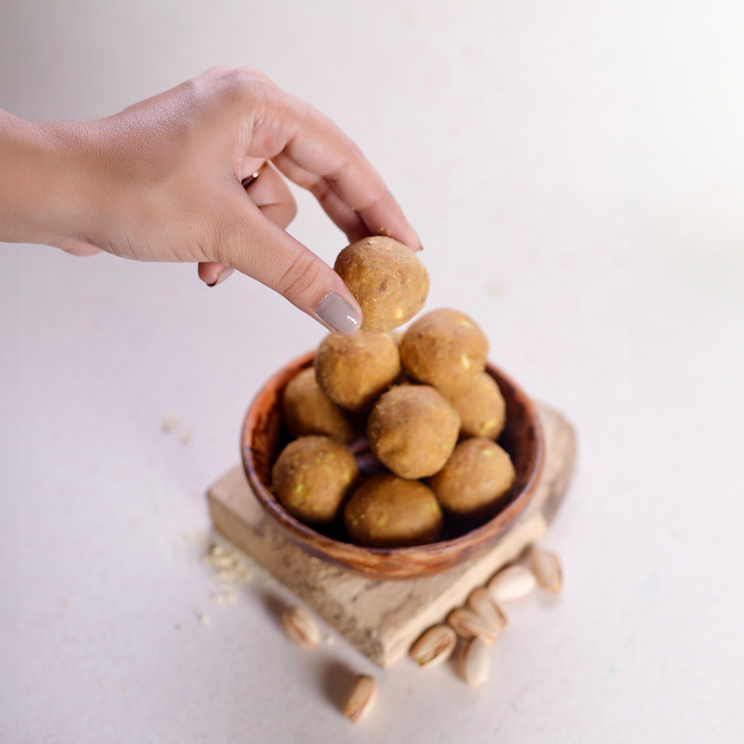Indulge in our Besan Pistachio Laddoo, a delightful blend of tradition and health. Inspired by Grandma's recipe, these laddoos are hand-rolled to perfection, capturing homemade goodness. Crafted with fine chickpea flour, natural sweetener palm jaggery, crunchy pistachios, and pure Desi cow ghee, they offer guilt-free indulgence in a nutritious treat! Whether craving a guilt-free snack or a healthier alternative to sweets, our laddoos are the perfect choice. Enjoy tradition with every bite, and savor sweet moments without compromise.