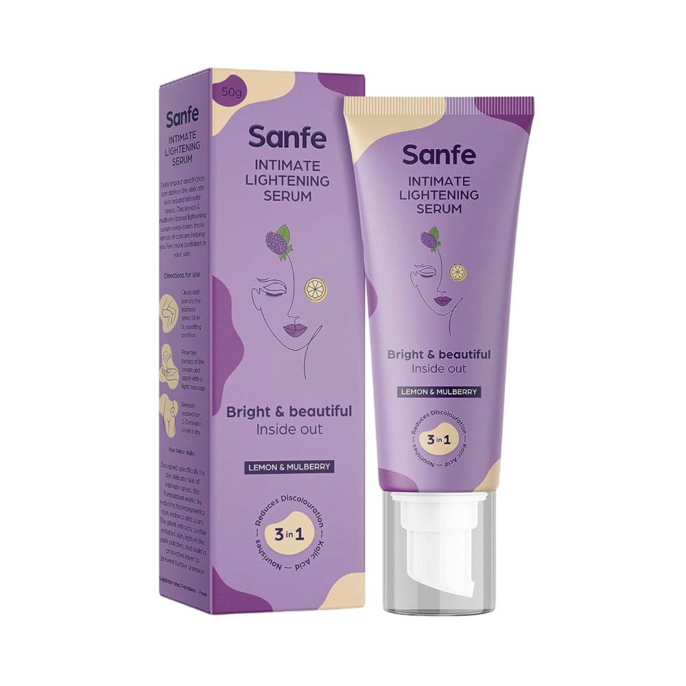 Sanfe Intimate Lightening Serum is a plant-based formulation designed to fade scars and even out skin tone in intimate areas. Enriched with vitamin C, moringa oleifera oil, mulberry extracts, kojic acid, and shea butter, it slows melanin production and boosts cell renewal for a naturally brighter appearance. Discolored areas blend seamlessly with the skin tone. Free from petroleum byproducts, lanolin, mineral, or vegetable oils, it absorbs quickly without leaving a sticky residue, ensuring long-lasting results with minimal reapplication.