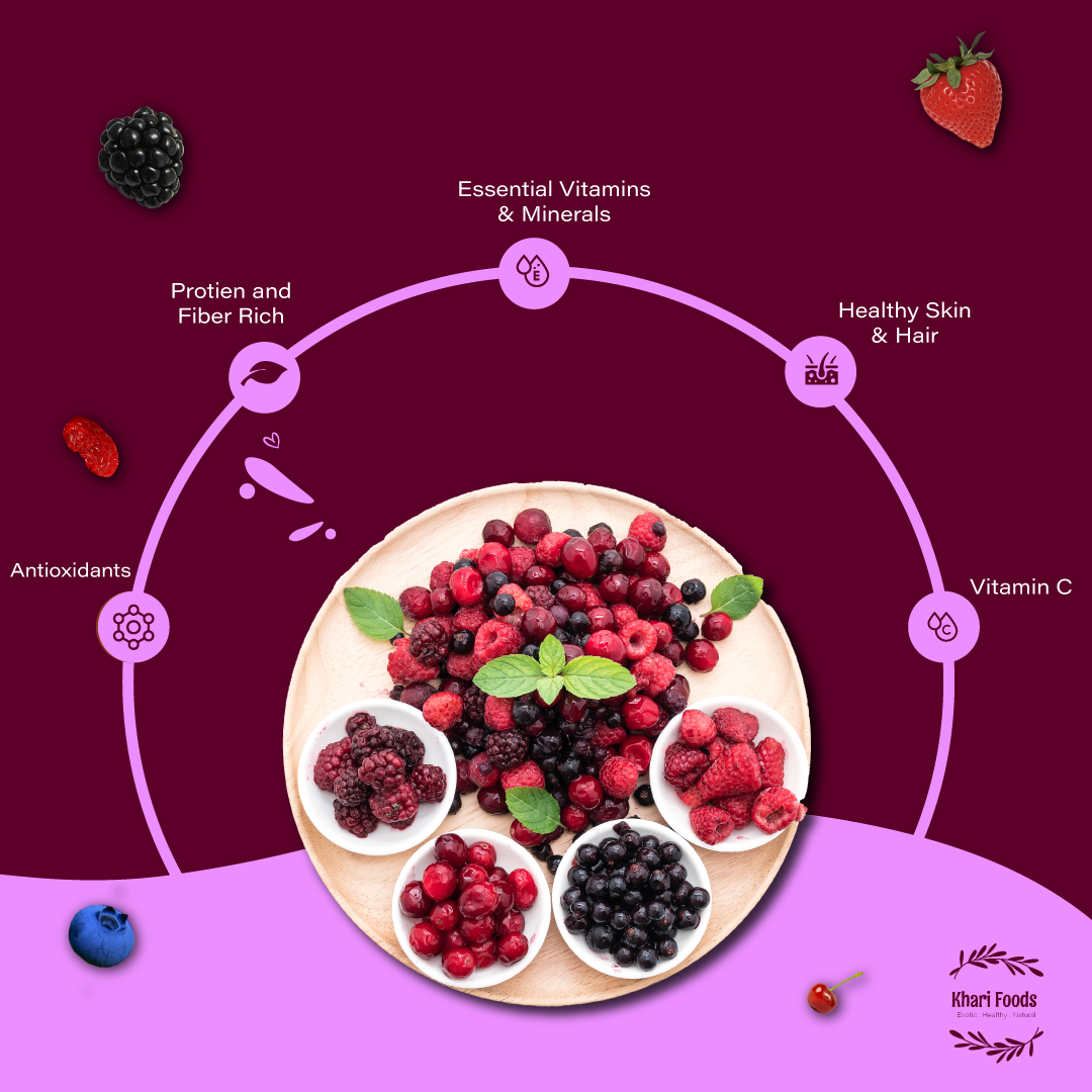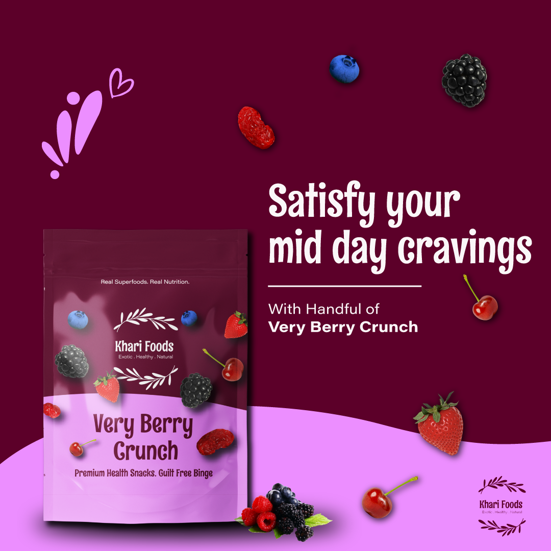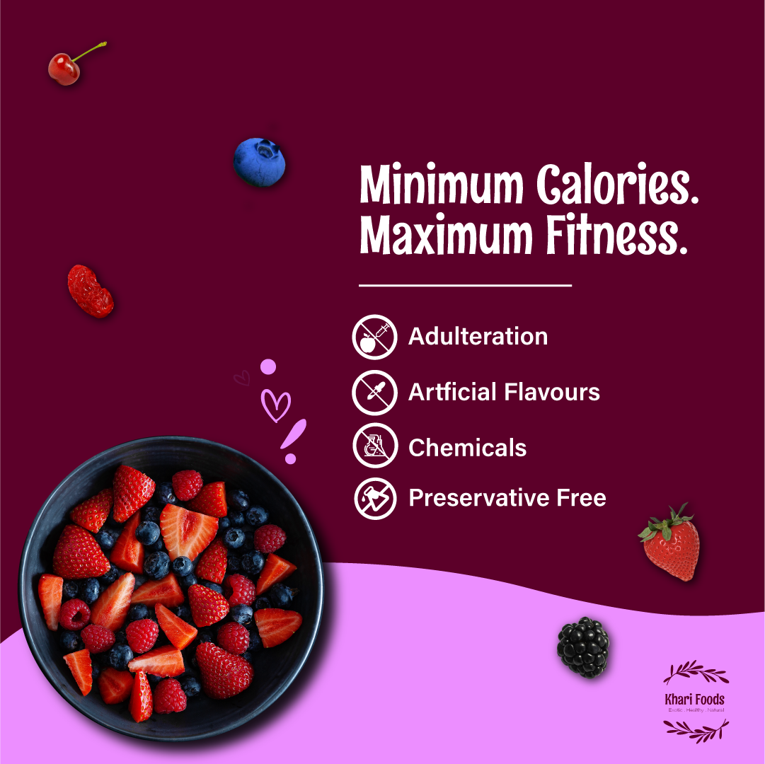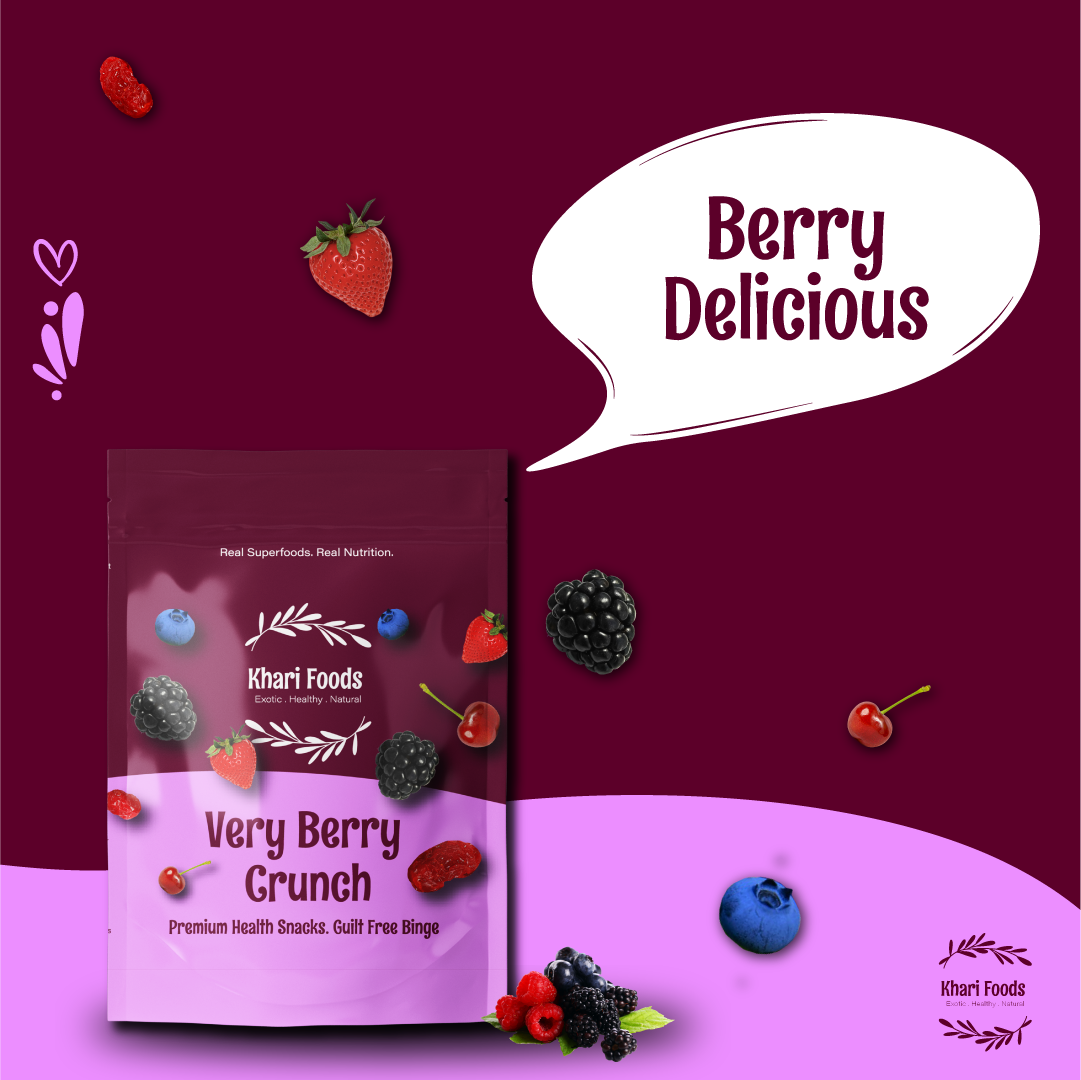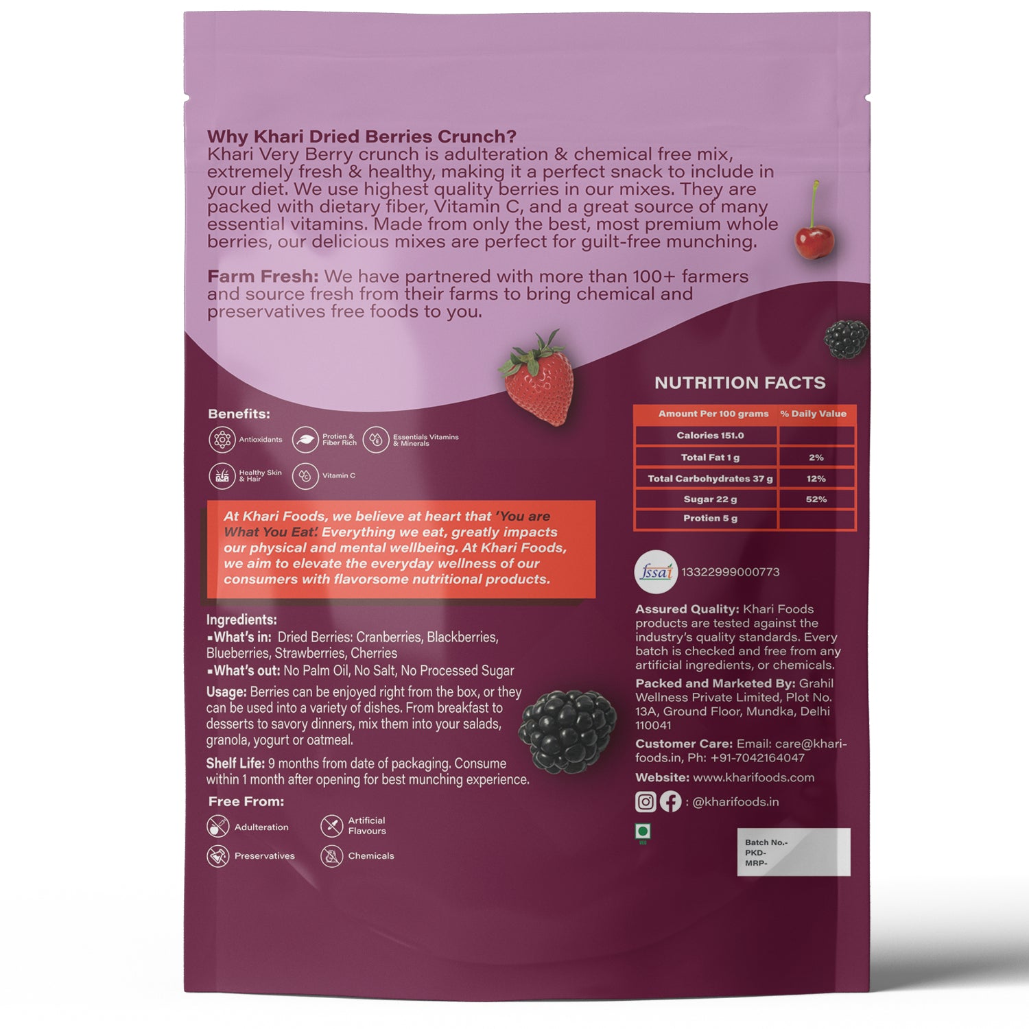 Khari Very Berry crunch is adulteration & chemical free mix, extremely fresh & healthy, making it a perfect snack to include in your diet. We use highest quality berries in our mixes. They are packed with dietary fiber, Vitamin C, and a great source of many essential vitamins. Made from only the best, most premium whole berries, our delicious mixes are perfect for guilt-free munching.