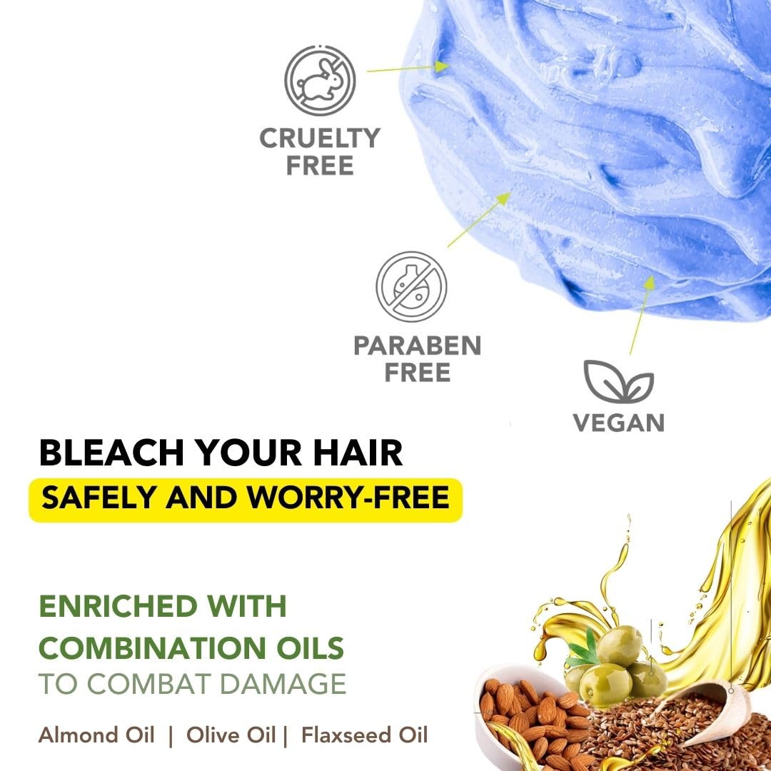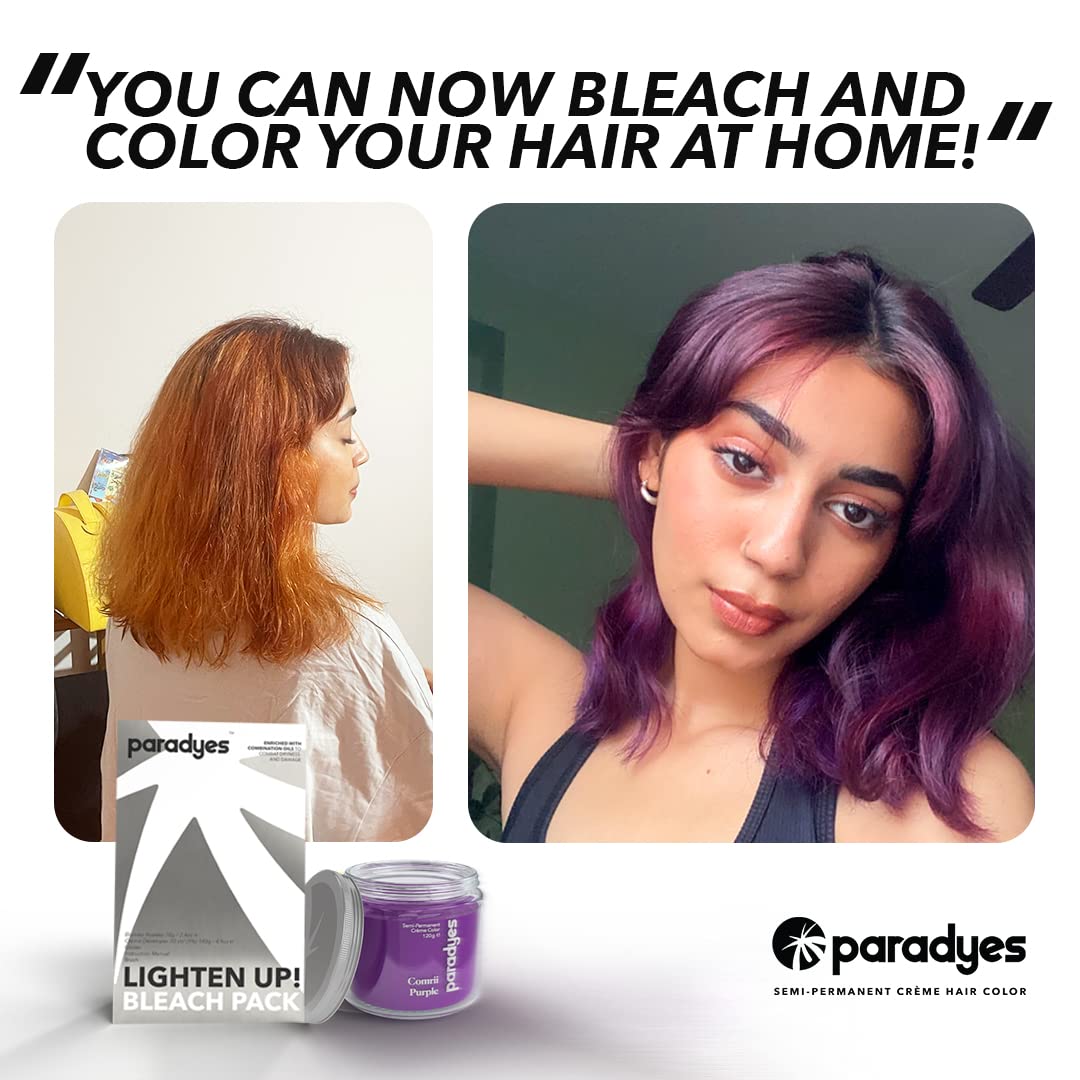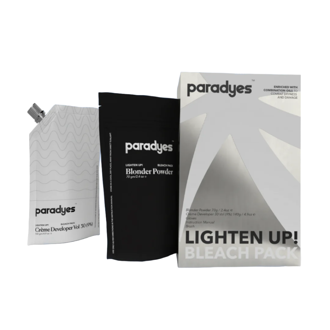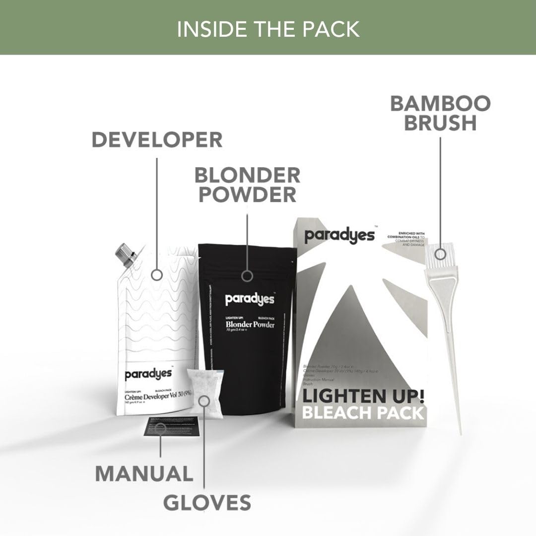 Paradyes Lighten Up Pack ensures that you can bleach your hair at home safely and worry-free. Our hair bleach kit can lift your hair up to 4-6 levels and comes enriched with combination oils to combat damage and dryness. It is a beginner-friendly, easy-to-use DIY bleach kit.