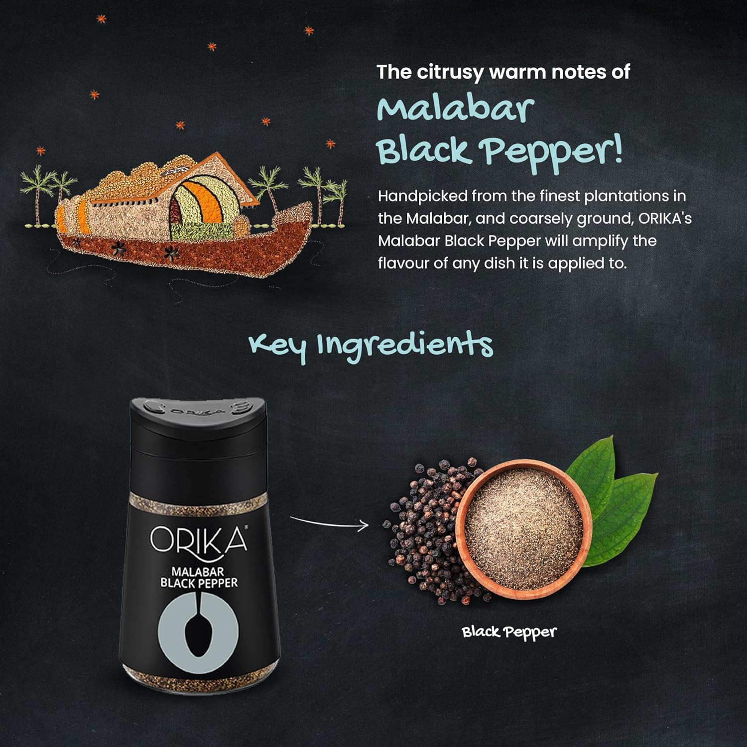 Handpicked from the Malabar region of Kerala; it is known for the world's finest quality of black pepper. With high natural volatile oil, a little sprinkle of this coarsely ground spice delivers a citrusy and warm note.